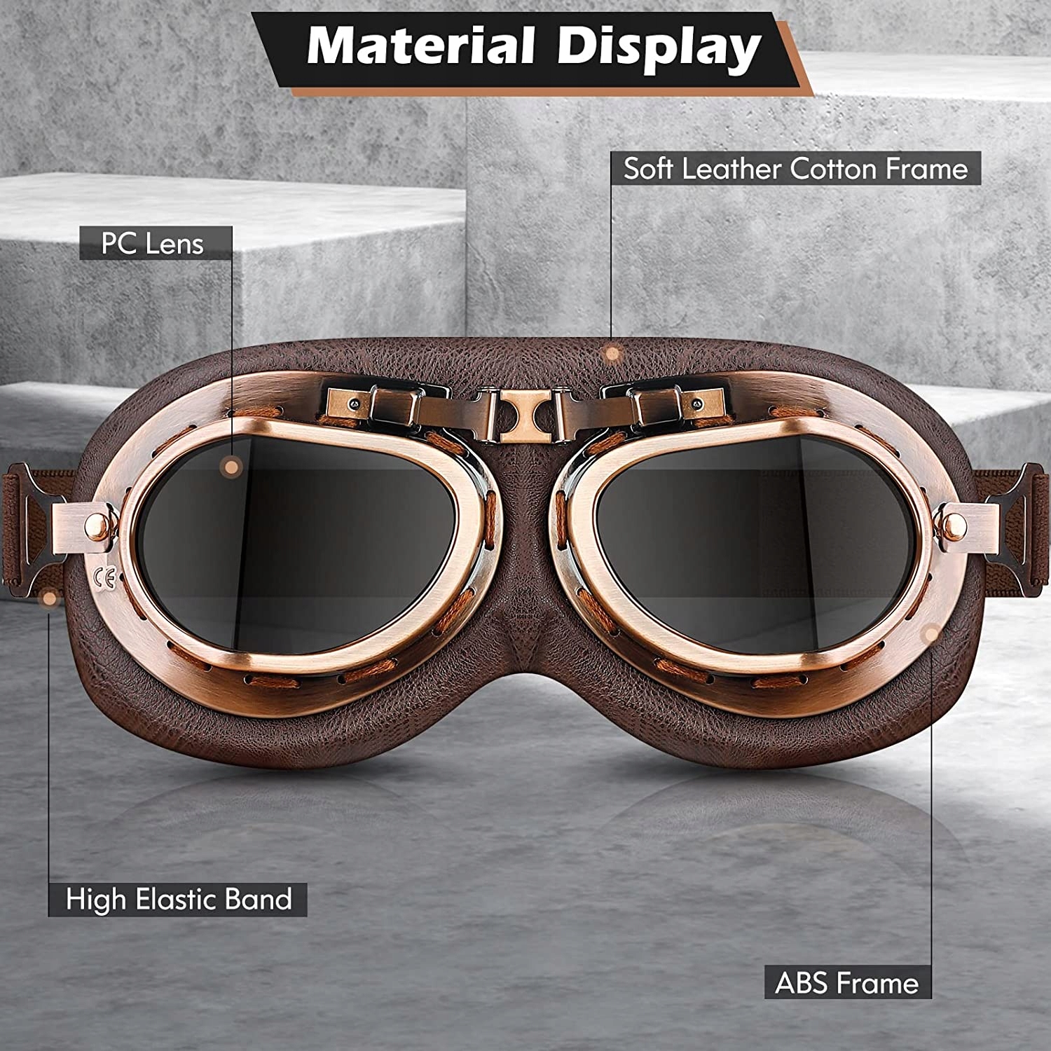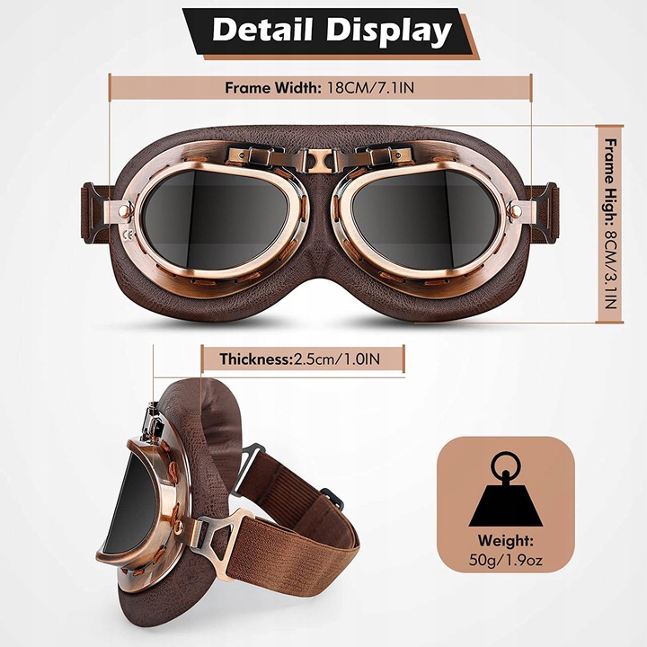 Стильні вінтажні мотоциклетні окуляри AVIATOR, оправа з мідним покриттям і лінзи ДВОЇ ПЛАНУВАННЯ привертають увагу! Великі лінзи забезпечують широке поле зору, тож ви завжди будете знати, що відбувається на дорозі. Набивка з поролону товщиною 15 мм забезпечує максимальний комфорт при носінні, а синтетична шкіра доповнює класичний вигляд окулярів. Силіконова стрічка регульованої довжини на внутрішній частині ремінця утримує окуляри на шоломі/голові. Якщо ви хочете добре виглядати на своєму мотоциклі, придбайте мотоокуляри AVIATOR - їхній незмінний дизайн ніколи не виходить з моди!