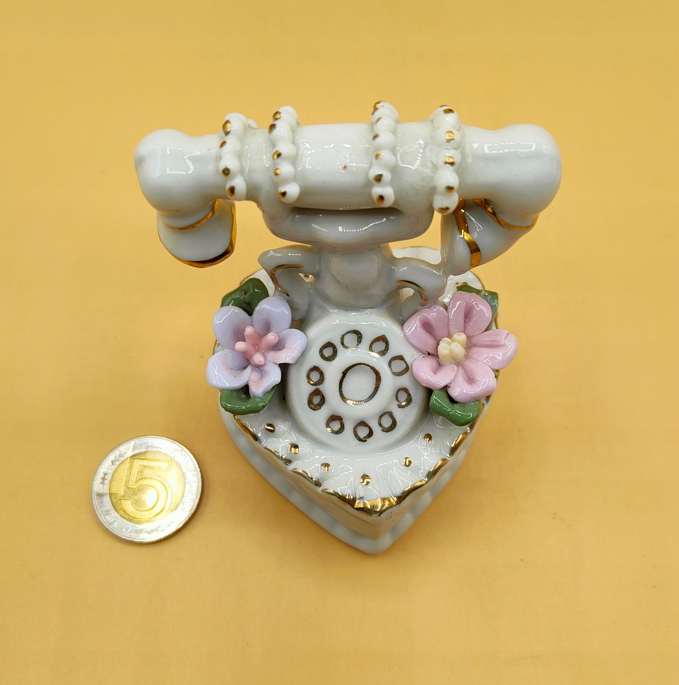 Зроблено з порцеляни, ручні роботи, красиві квіти. Розміри: висота 8 см/6,8 см/6 см, вага 140 грам. Цей телефон перетворюється. Живий вигляд так само красиво, як на знімках. Старовинний предмет. Рекомендую.
