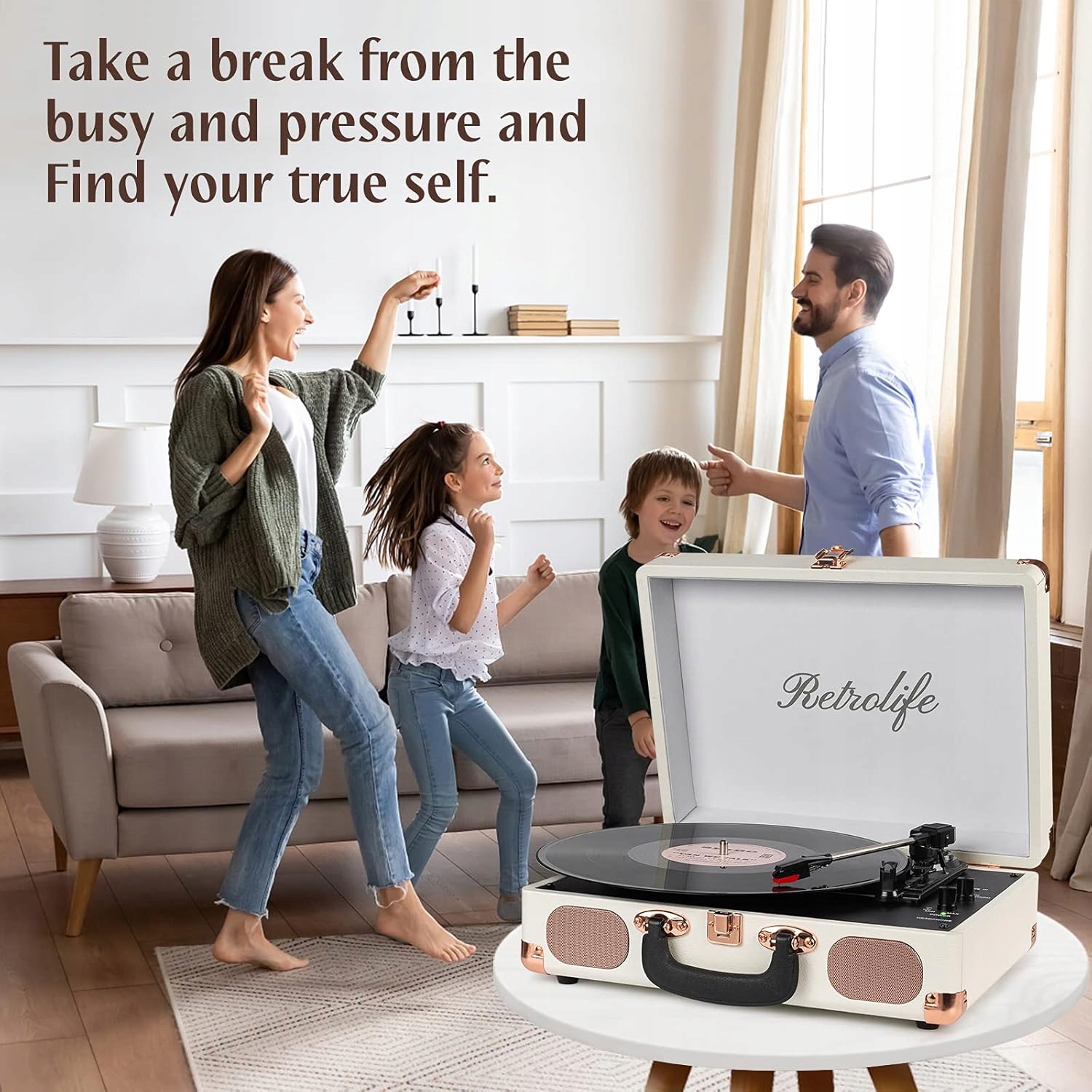 Повертинний стіл оснащений автоматичною функцією зупинки, яка вимикає обертання диска після відтворення. Ви можете легко змінити джерело звуку завдяки комутатору режиму Bluetooth/Aux-In/Phono. Це ідеальний пристрій для миттєвого відпочинку, соціальних зустрічей або домашніх подій.