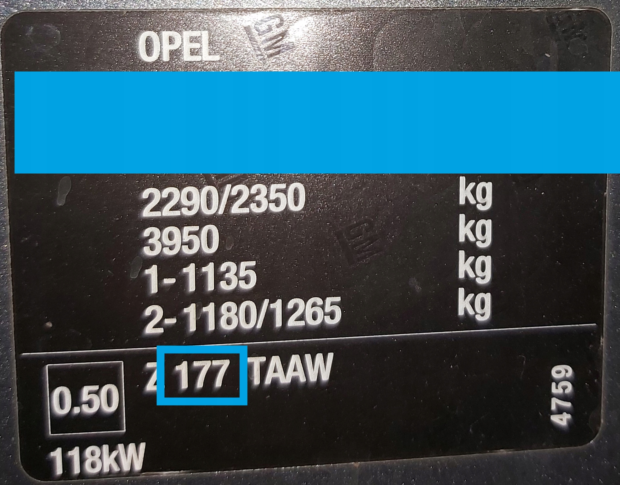 Кольорове маркування автомобілів OPEL в 90% випадків розташоване біля дверей водія - на порозі або біля петель. У новіших моделях чорна наклейка з кольоровим кодом може бути розташована біля пасажирських дверей. У випадку старих автомобілів шукайте його під капотом. На фото нижче колірний код OPEL 177 оточений синьою рамкою.