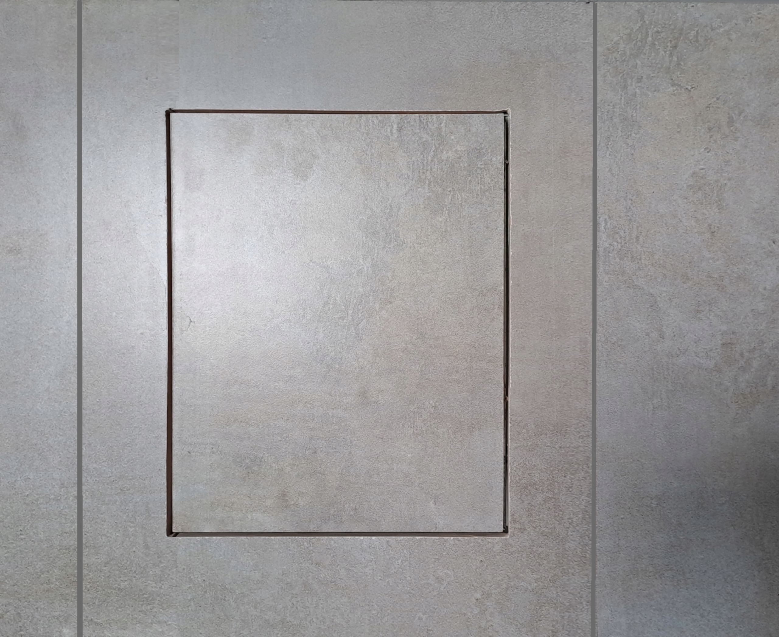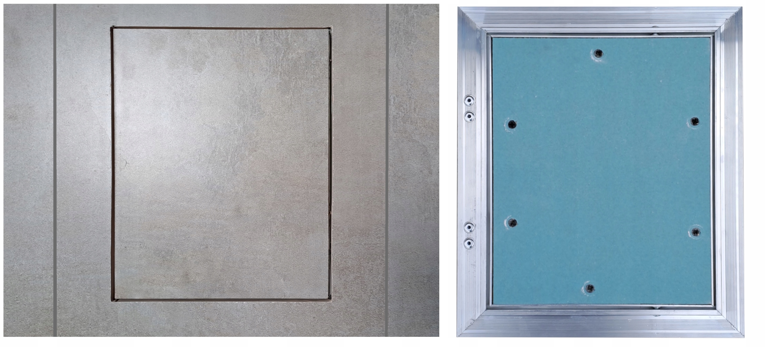 Ревізійна кришка CERAMIKO PURE - модель алюмінієвих ревізійних дверей з фіксованими петлями, заповнена водостійким гіпсокартоном, закривається на два замки клац-клак, покращена гумовою прокладкою - призначена для плитки.