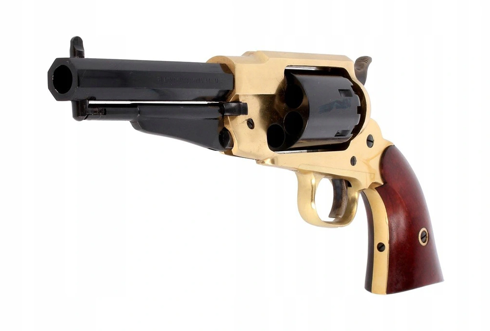 Pietta Remington New Army SHERIFF Texas 1858 .44 - це дуже добре зроблена копія дульнозарядного револьвера з чорним порохом 1863-1875 років. Модель Remington відрізняється міцною рамою з оксидованої латуні глибокого чорного кольору та ручками з горіхового дерева. Калібр .44