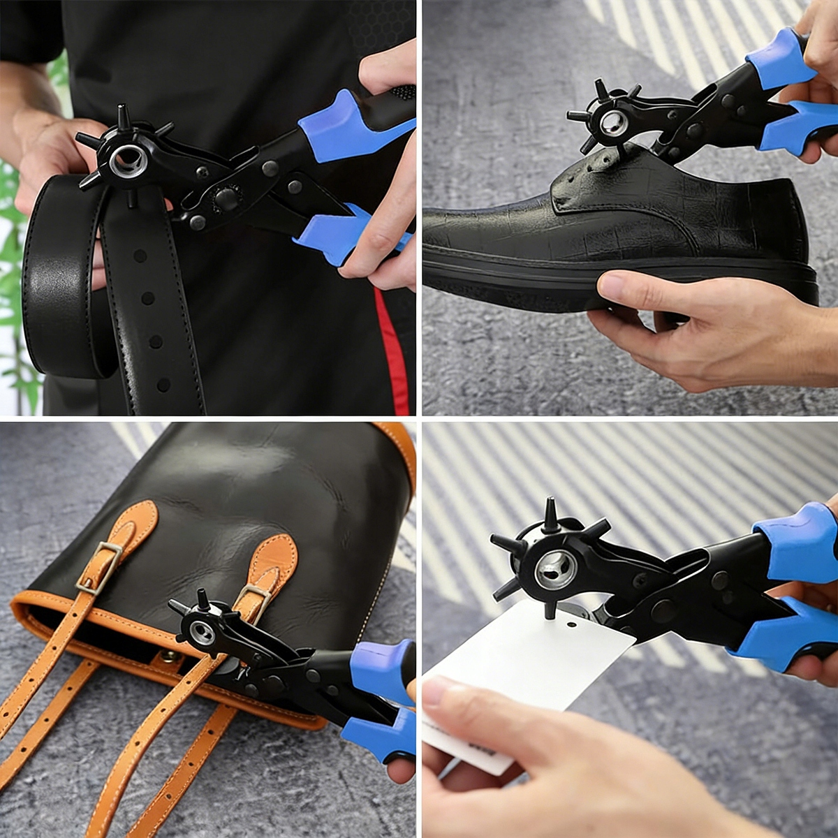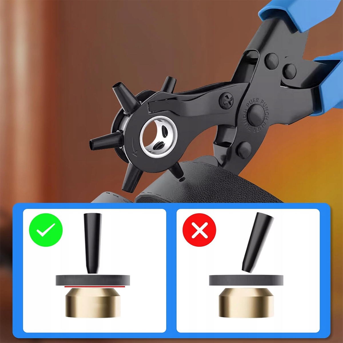 Діркопробивач має 6 отворів різного діаметру: 2 мм, 2,5 мм, 3 мм, 3,5 мм, 4 мм і 4,5 мм. Він широко використовується для пробивання круглих отворів у шкірі, пластику, полотні, тканинах, сідлах та подібних матеріалах; особливо корисний як удар по шкірі.
