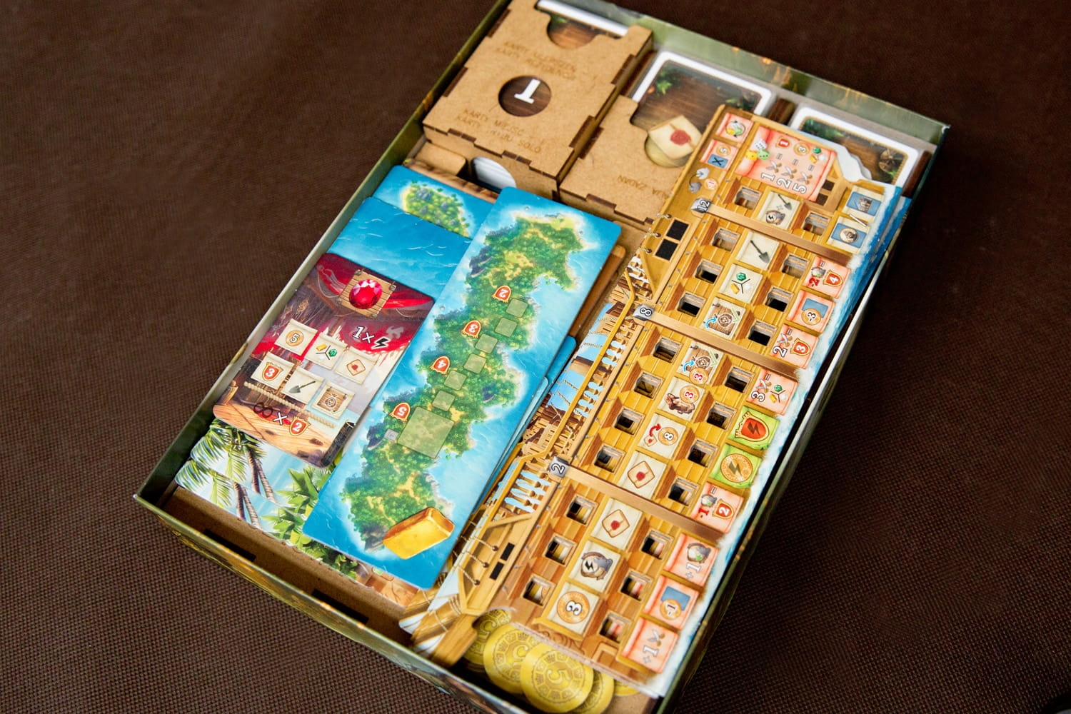 - 3 контейнери для жетонів дублонів, кубиків, «жетонів рому» та «жетонів гармат» — це підноси, які можна поставити на стіл,