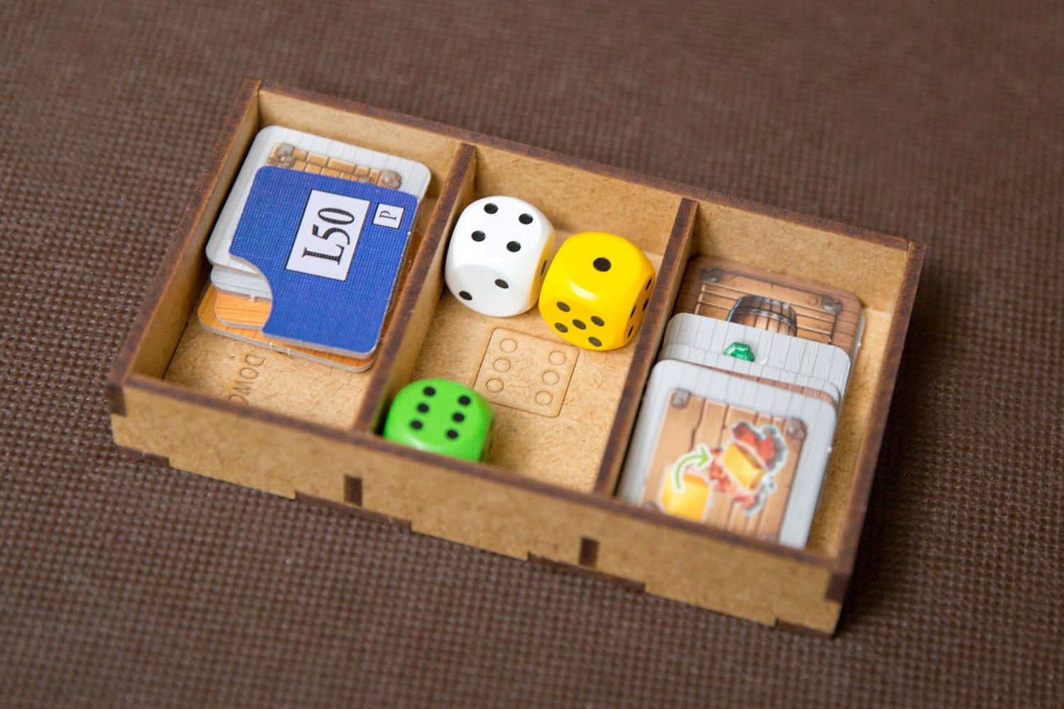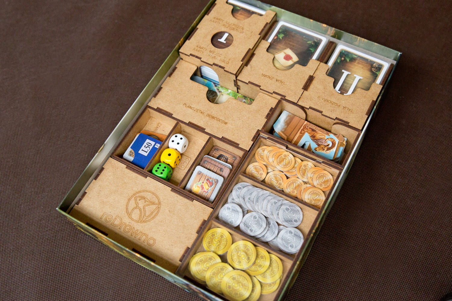 - 1 контейнер для сортування карток рівня I (покращення, резиденції, місця), карток режиму соло,