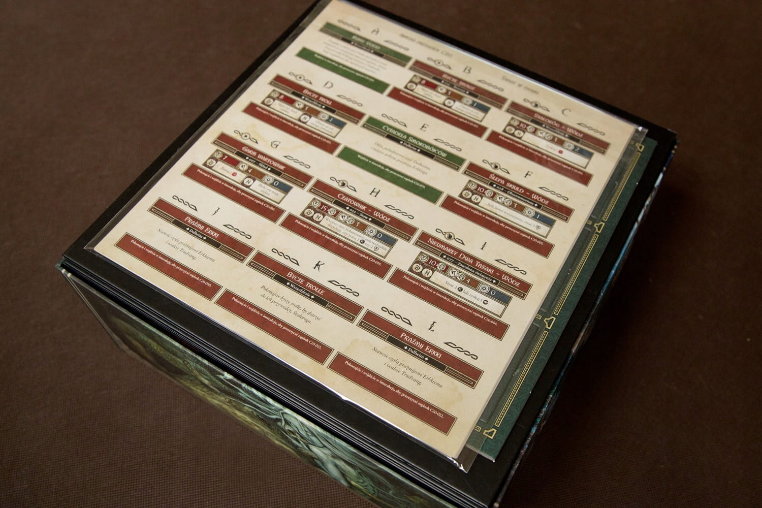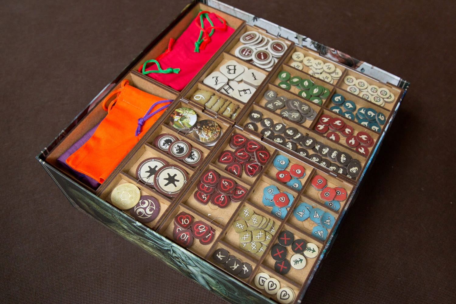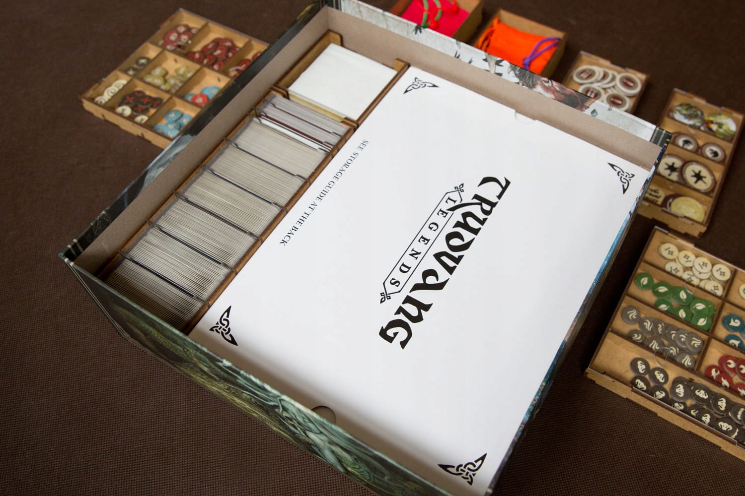 Вставте відповідність пригодницькій грі Trudvang Legends. Контейнери для жетонів і маркерів також служать підносами, які можна поставити на стіл. Фігурки зберігаються в оригінальному пластиковому литнику. Для карт, перетасованих під час гри, вкладиш забезпечує простір для них у преміальних рукавах розміром до 110 мікрон - це карти Атаки ворогів / Карти подій / Карти подвигів для кожного Героя. Решта листівок без рукавів. На фотографіях зображені карти в гільзах Gamegenic 100 мікрон. Відділення для карток героїв забезпечують більше місця, щоб можна було «зберегти» гру для заданого персонажа.