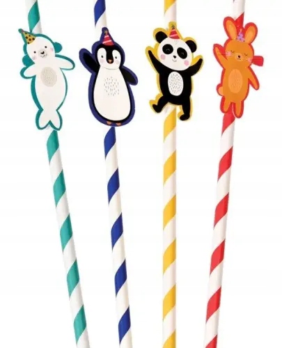 Різнокольорові соломинки для дітей з вишуканими декораціями. Ідеально підходить для дитячого балу, дня народження та інших заходів. Оскільки вони зроблені з паперу, ви можете використовувати їх, не турбуючись, що вони забруднюватимуть навколишнє середовище, коли їх викинуть. У поєднанні з чашками, серветками, тарілками та іншими виробами серії вони створять чарівний, веселий набір.