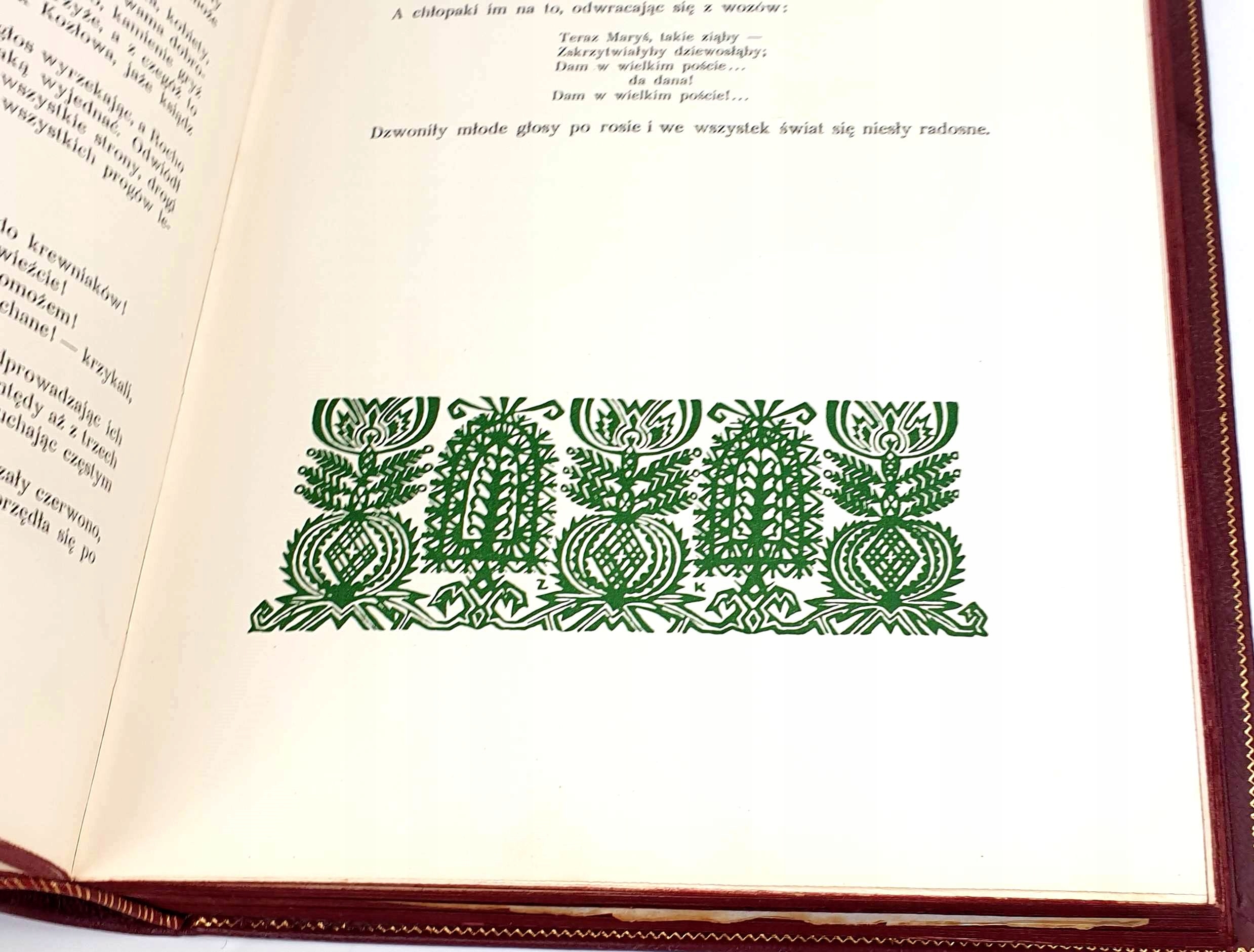 Найбільш вражаюче, прекрасне видання роману, за яке автор отримав Нобелівську премію з літератури за 1924 рік - і одна з найкрасивіших польських ілюстрованих книжок. Різнокольорові дошки, численні одноколірні прикраси в тексті. Книжка гарно надрукована, великим шрифтом, на хорошому папері.