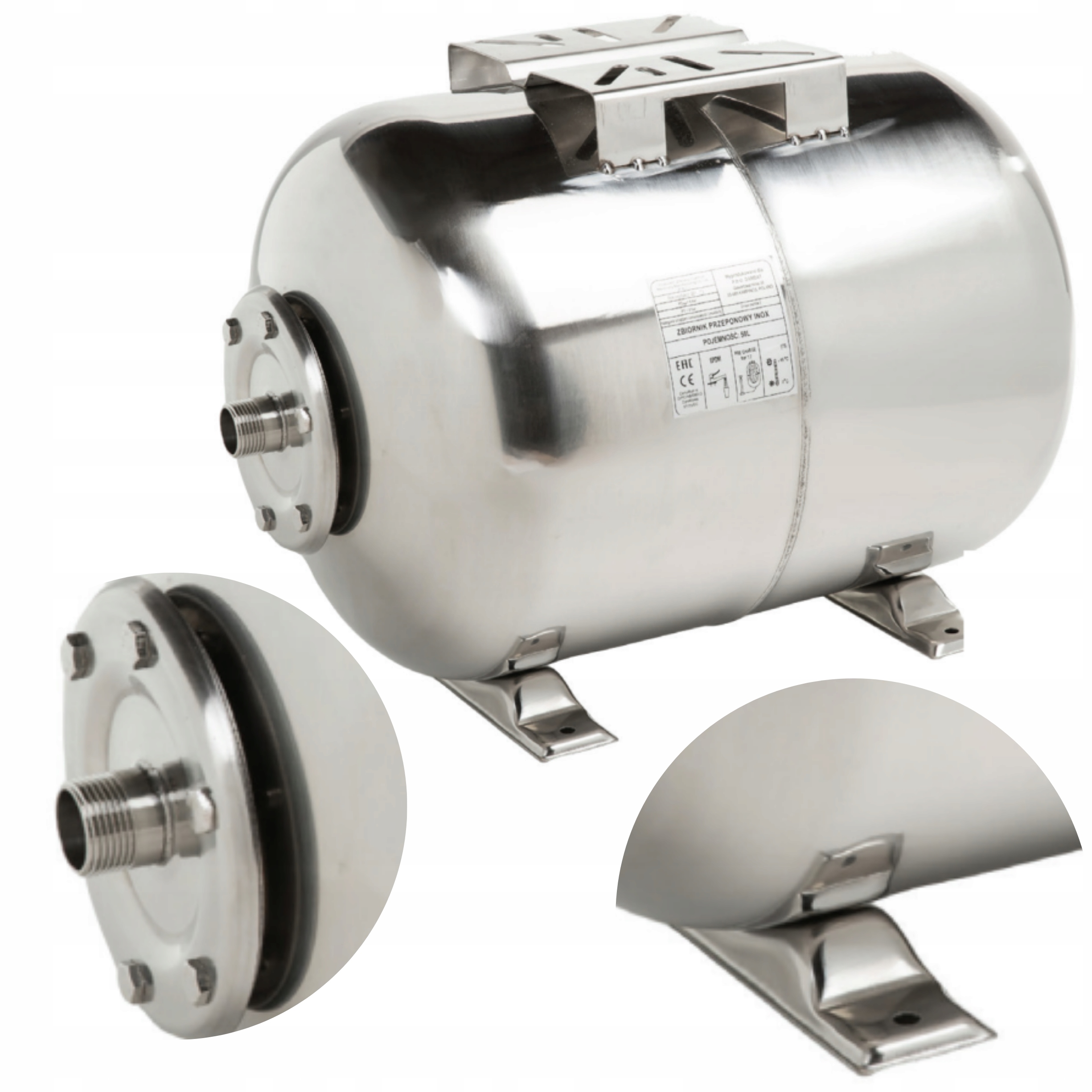 Баки горизонтальні розширювальні з нержавіючої сталі AISI304 з ємностями для накопичення води в системах водопостачання. Як кожух резервуара, так і фланець виготовлені з нержавіючої сталі. Резервуари оснащені діафрагмами EPDM. Виготовлений з нержавіючої сталі, резервуар можна встановлювати в колодязях і вологих приміщеннях без ризику прискореної корозії.