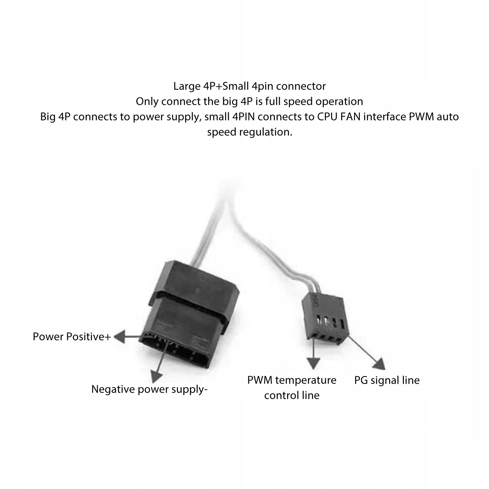2. ПІДТРИМКА АВТОМАТИЧНОГО РЕГУЛЮВАННЯ ШВИДКОСТІ ШІМ: великий 4P підключений до джерела живлення, маленький 4PIN підключений до інтерфейсу вентилятора процесора, підтримує автоматичне регулювання швидкості ШІМ.