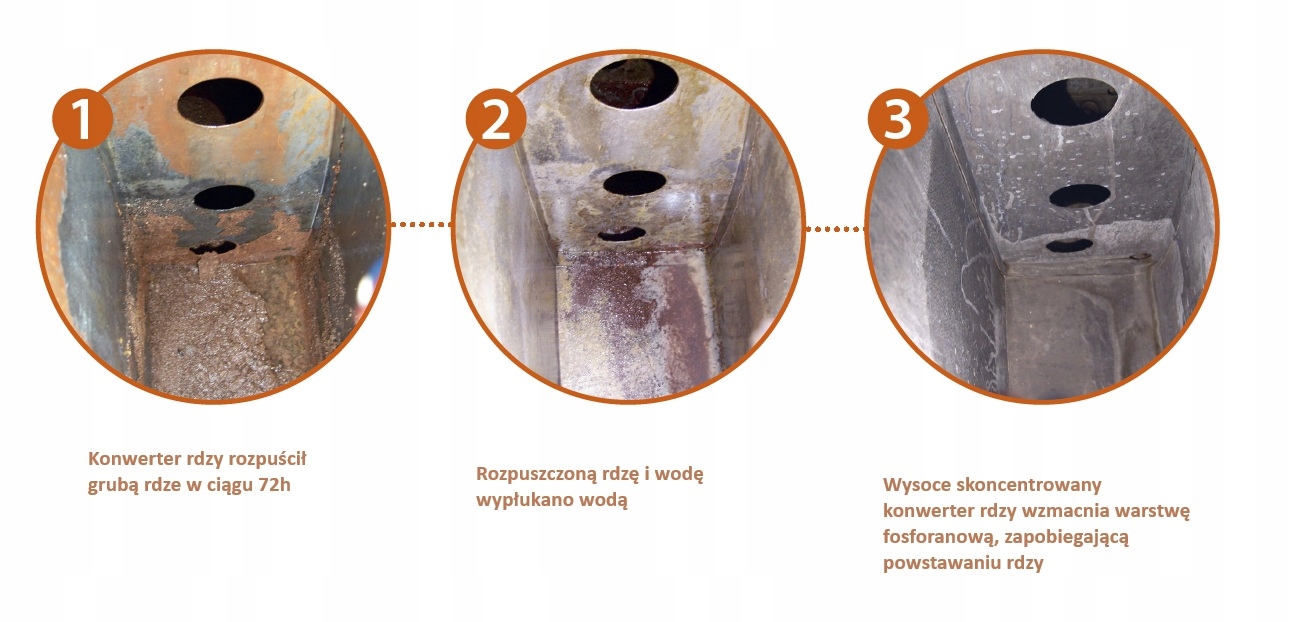 Цей темно -сірий шар (фосфат), залишений цим іржеєром на залізі та сталі, ефективно захищає металеві поверхні від іржі. Сільська поверхня залишається ідеально очищеною і готовою до остаточного покриття фарбою, смолою, лакам, дьогтю, воску, олова, цинку або пластику.