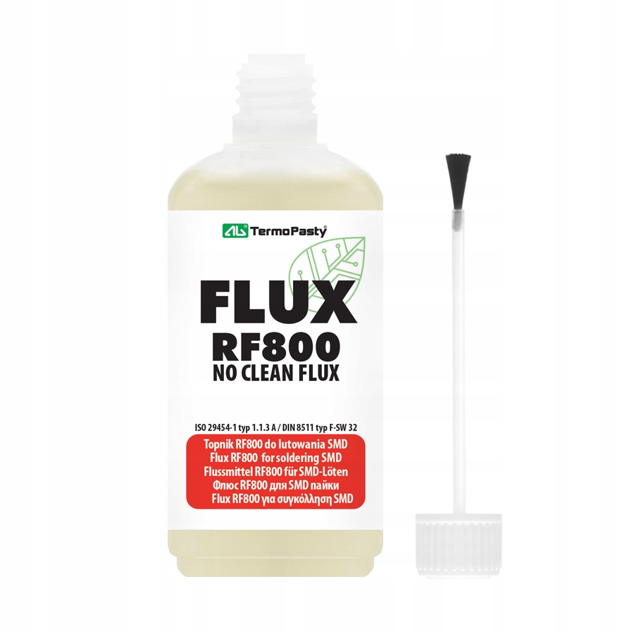 RF800 flux — це середньоактивний розчин каніфолі, який не потребує промивання. Використовується для машинного паяння як у професійній, так і в побутовій електроніці, відбілювання кінців проводів, змішаного монтажу та паяння пасивованих поверхонь. Крім того, розчин характеризується тим, що відмінно змочує поверхні Cu і PbSn. Флюс слід зберігати в оригінальній упаковці, подалі від сонячних променів у сухому, прохолодному та добре провітрюваному приміщенні.