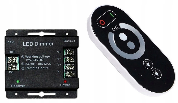 Пристрій використовується для легкого та швидкого керування інтенсивністю світла всіх одноколірних стрічок. Зв'язок між контролером і пультом дистанційного керування відбувається за допомогою радіохвиль - RF. Радіус дії пульта на відкритому просторі становить приблизно 10 метрів. Запрограмовані на заводі функції та режими дозволяють, серед іншого: для дистанційного: увімкнення та вимкнення світла, затемнення та освітлення статичних кольорів. Максимальне споживання всіх підключених ділянок світлодіодних стрічок при напрузі 12 В не може перевищувати 216 Вт, інакше інсталяцію слід розширити підсилювачами сигналу або диммером більшої потужності. Пристрій також зберігає в пам'яті останню використану комбінацію - т.зв функція "пам'ять вимкнення живлення" дозволяє відображати ту саму програму після ввімкнення/повторного відключення живлення контролера.