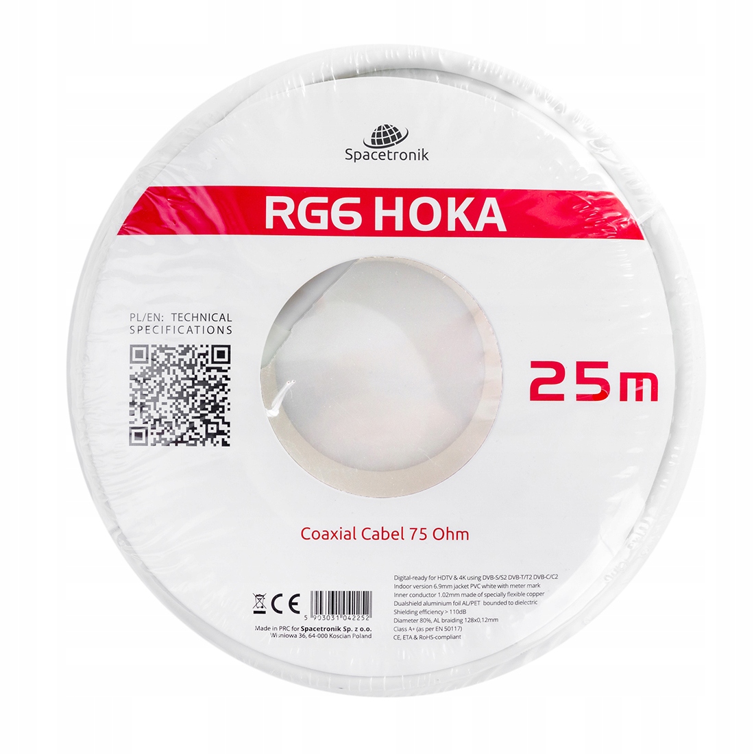 Кабель RG6 HOKA — це високоякісний кабель, виготовлений із сировини найвищої якості. Виріб дуже часто вибирають професійні монтажники через його надійність і довговічність вище середнього. Кабель буде працювати в усіх установках наземного, кабельного та супутникового телебачення. Залежно від кольору, їх можна використовувати для встановлення всередині приміщень (білий) і на вулиці (чорний)