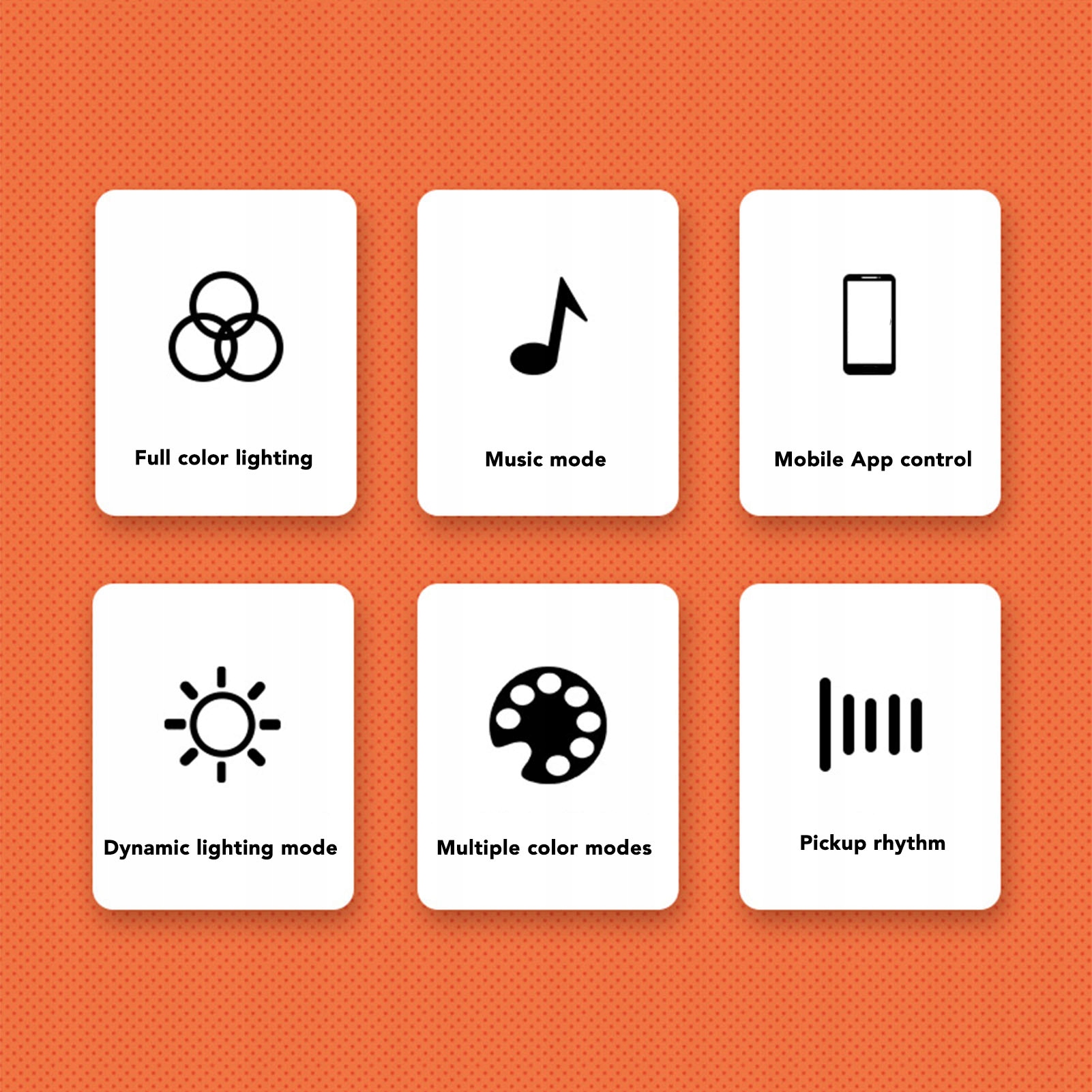2. Динамічний ритм: оснащений дуже чутливим мікрофоном та побудованим динамічним контролем арматури AGC, може йти в ногу зі складними мелодіями, швидко відтворюючи та з низькою затримкою. Він оснащений мобільним додатком, який дозволяє вільно контролювати яскравість, колір, режим та іншу інформацію.