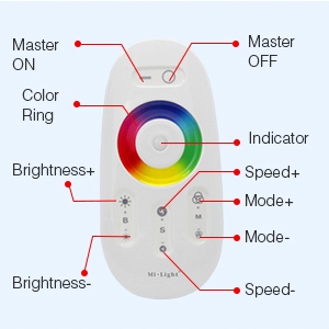RGB RF Set: приймач + віддалений контроль 12V/24V 120W/240W B> присвячений світлодіодним смужкам RGB (багатокольованих). колір і інтенсивність світла. Зв'язок з контролером здійснюється за допомогою радіохвиль RF , які полегшують контроль - діапазон пілота досягає 30 м. проводиться при дотику до барвистого кільця, також можна скрасити або зменшити постійний колір та програми, використовуючи відповідні сенсорні кнопки. Зони, кнопка "o" - вимикає всі зони. /p>