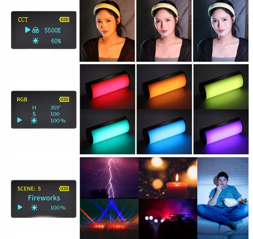 - Лампа має OLED-дисплей, на якому відображаються налаштування: обраний режим роботи, колірна температура, рівень яскравості, тип встановленого ефекту освітлення, рівень насиченості, положення в палітрі RGB , рівень зарядженості батареї.