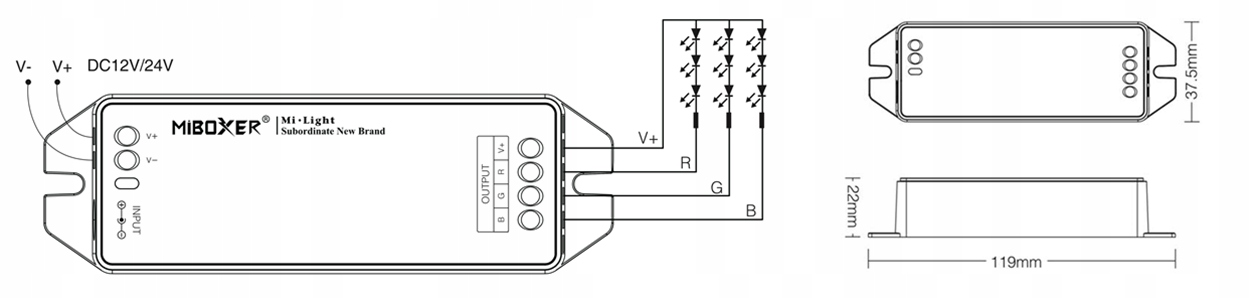 RGB 12V/24V DC 12A Світлодіодний приймач Company Mi-Light -це компактний пристрій, який використовується для управління різнокольоровим світлодіодним освітленням.