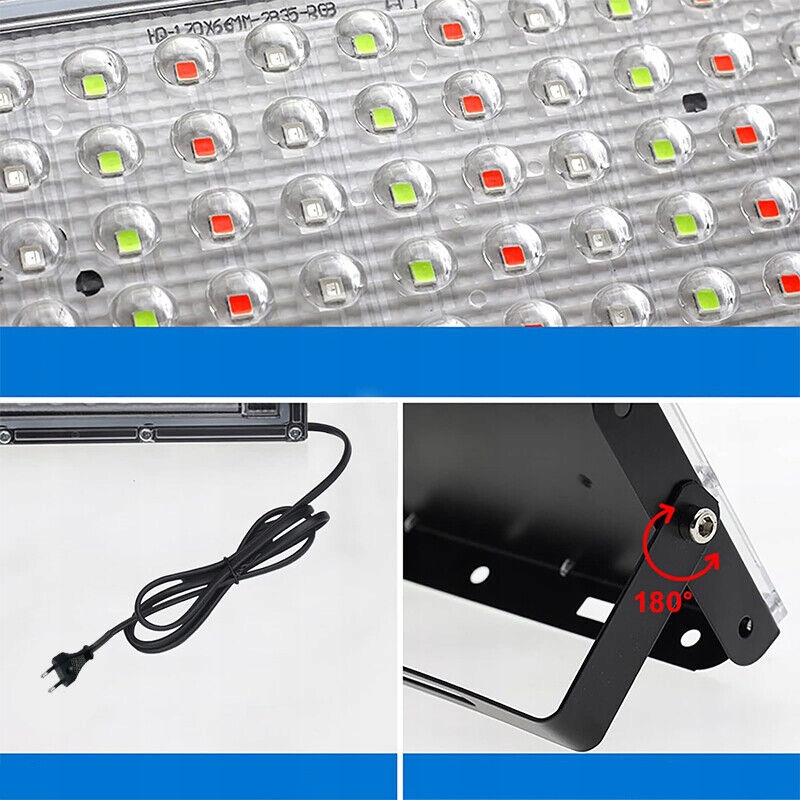 - Прожектор RGB постачається з кабелем довжиною 1,5 м метр і металевий кронштейн, що регулюється на 180 градусів.