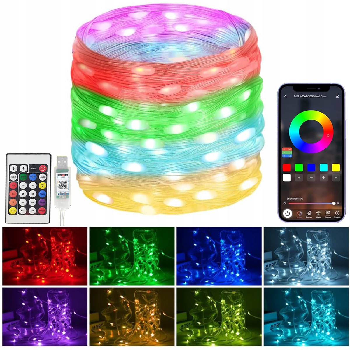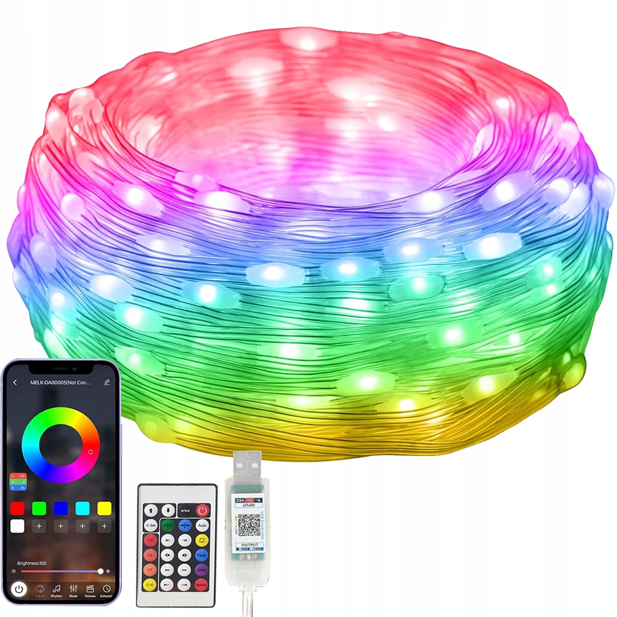Оновлена багатоколірна інтелектуальна мікросхема RGB із насиченими кольорами та освітленням на 360°. У комплект входить інфрачервоний пульт дистанційного керування, за допомогою якого можна перемикатися між різними режимами мигання. Ви також можете відсканувати QR-код на контролері, щоб завантажити програму "LightsPlay". За допомогою телефону ви можете легко встановити час освітлення та переключитися на улюблений колір, яскравість і режим.