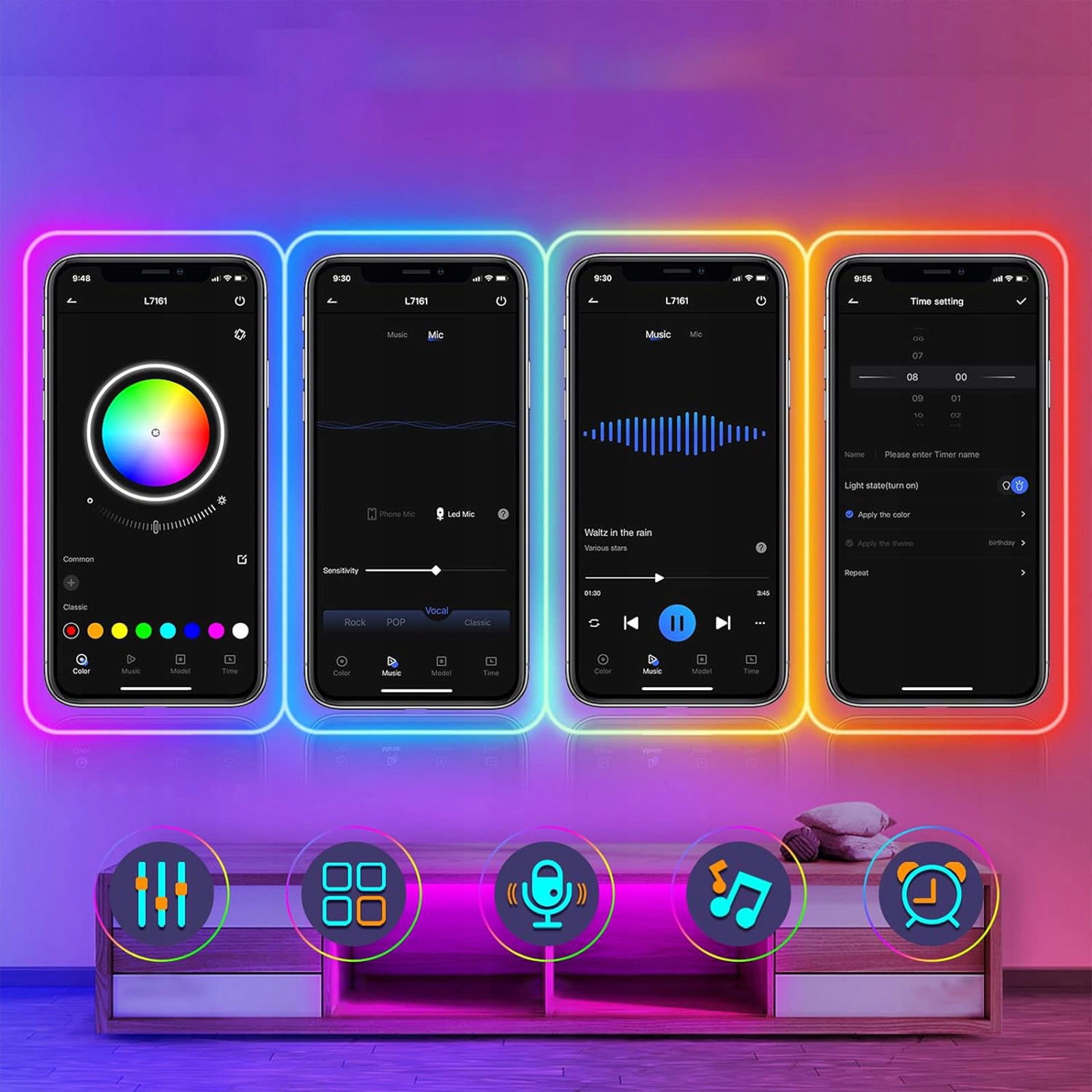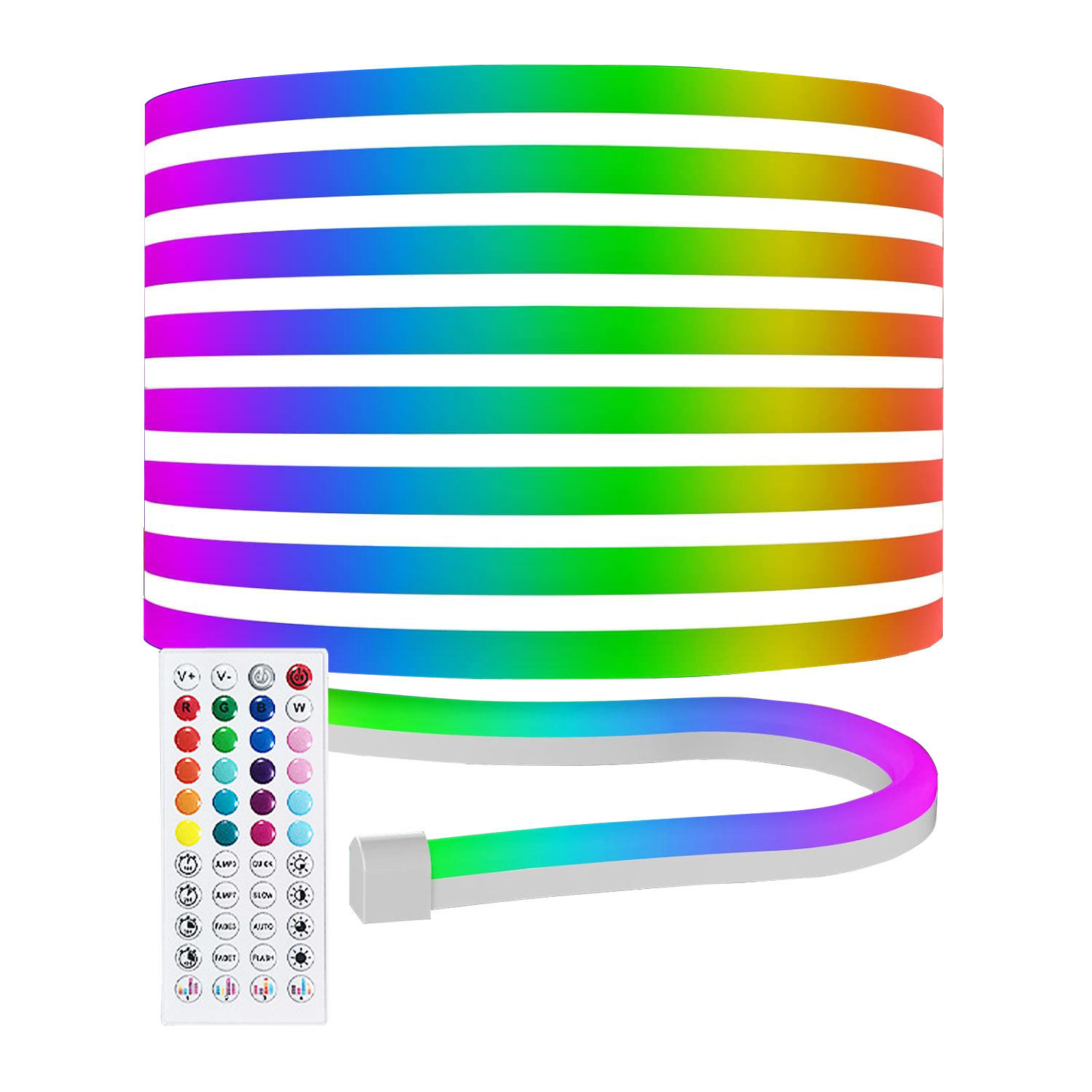 Наша інтелектуальна неонова світлодіодна стрічка має багато функцій, що спрощує її використання та керування. За допомогою пульта дистанційного керування та програми ви можете змінювати налаштування освітлення та кольори відповідно до свого настрою та оточення. Ви також можете використовувати функцію таймера сну, щоб увімкнути всі світлодіодні неонові ліхтарі та ранкові будильники у вашій кімнаті.