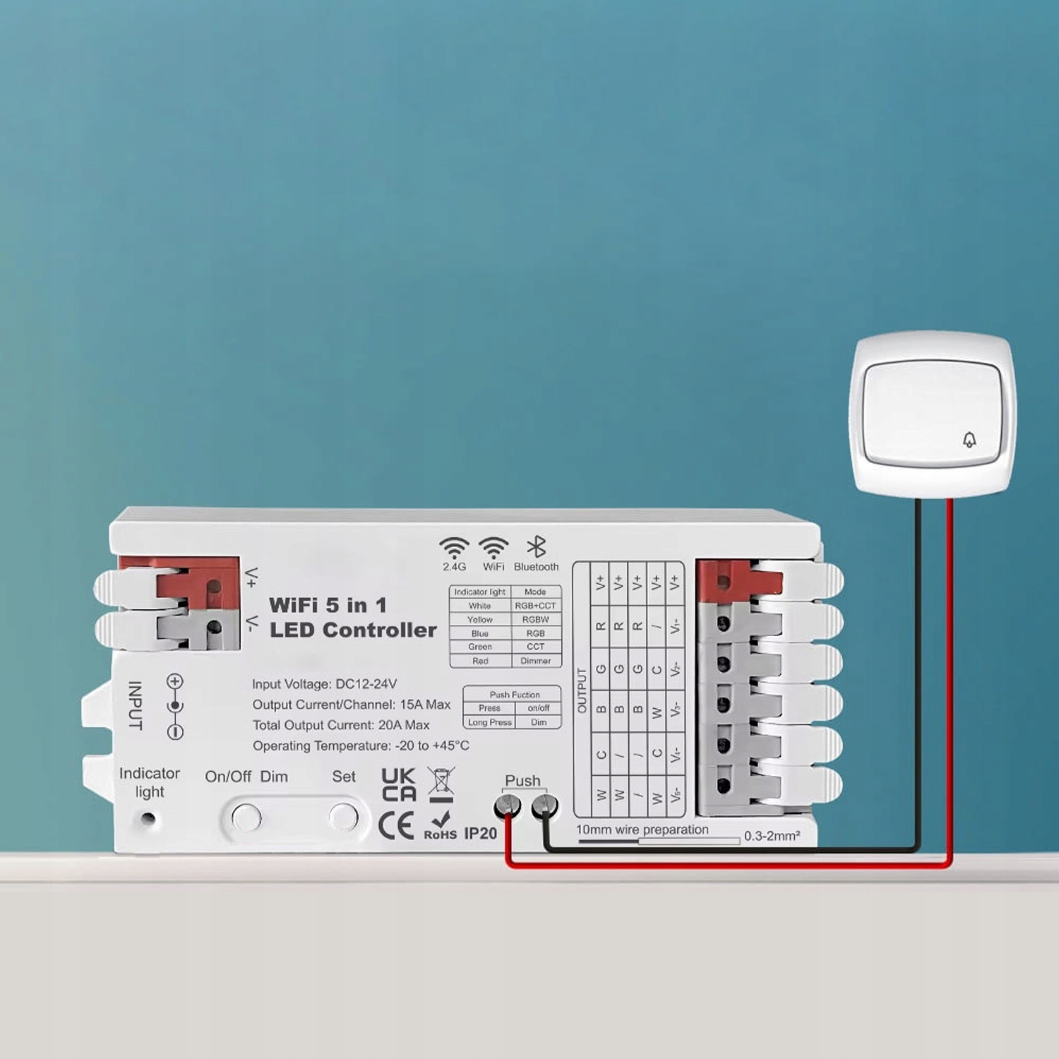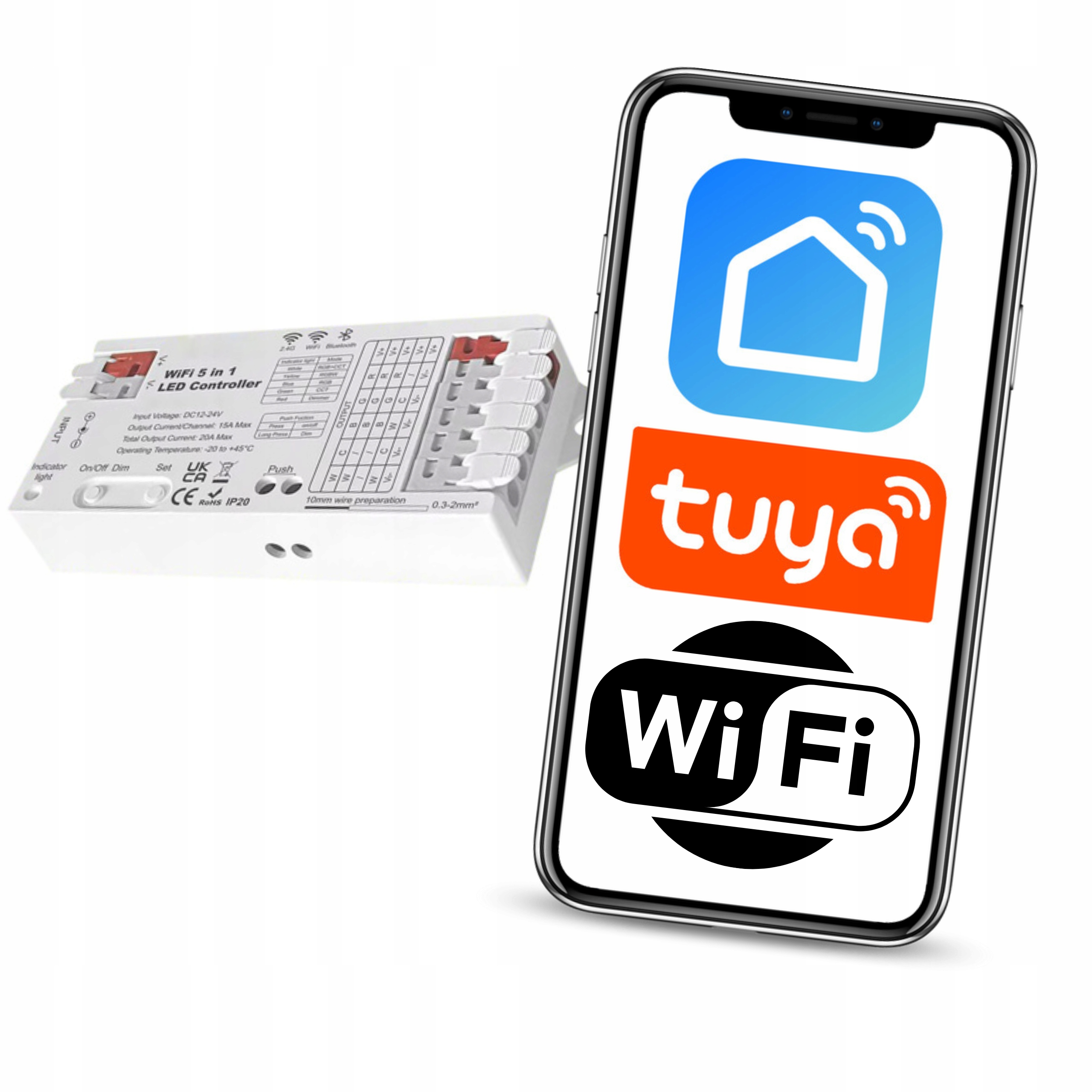 світлодіодний контролер Gledopt wifi+bluetooth 5in1 rgbcct - це розширений пристрій з високою потужністю, створеним для контролю DIM, CCT, RGB, RGBW та RGBCCT LED. Завдяки сумісності з додатком Tuya / Smart Life та Google та Amazon Assistants забезпечує повний контроль над освітленням з будь -якої точки світу. Підтримує 5 типів світлодіодні стрічки: