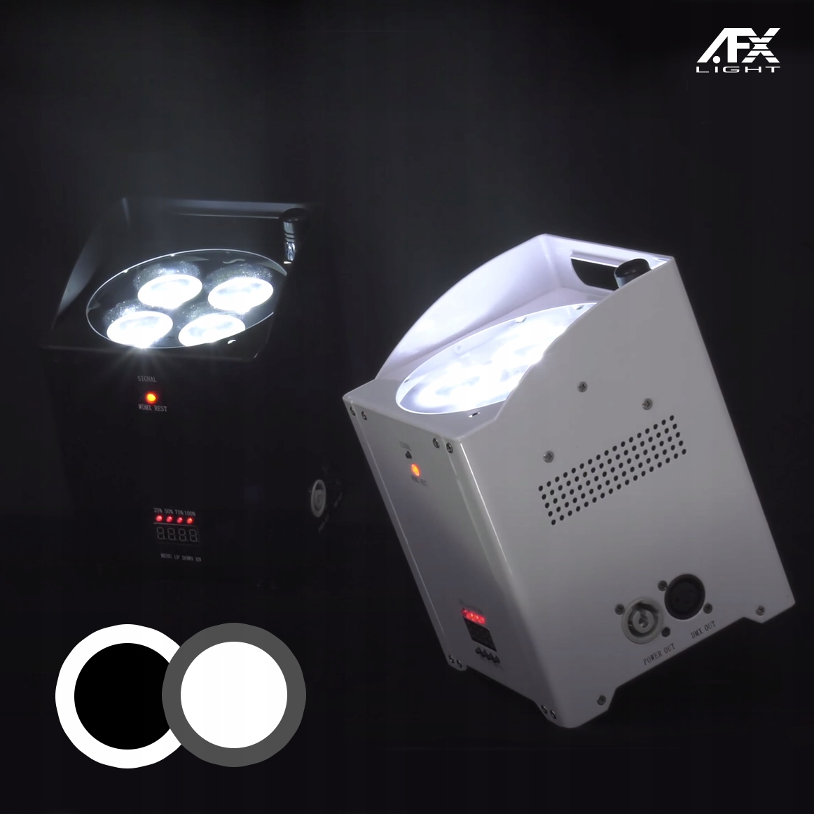 Це професійний бездротовий прожектор від бренду AFX Light. Оснащений акумулятором ємністю 8 Ач, він забезпечує до 12 годин роботи. Крім стандартних RGB (red, green, blue), пристрій також дозволяє використовувати кольори amber (бурштиновий) і білий. Освітлювач з батарейним живленням має вбудований бездротовий приймач DMX. Прожектор запрограмований за допомогою автоматичних програм і може управлятися за допомогою звуку або контролера DMX. Пристрій поставляється з інфрачервоним пультом дистанційного керування.