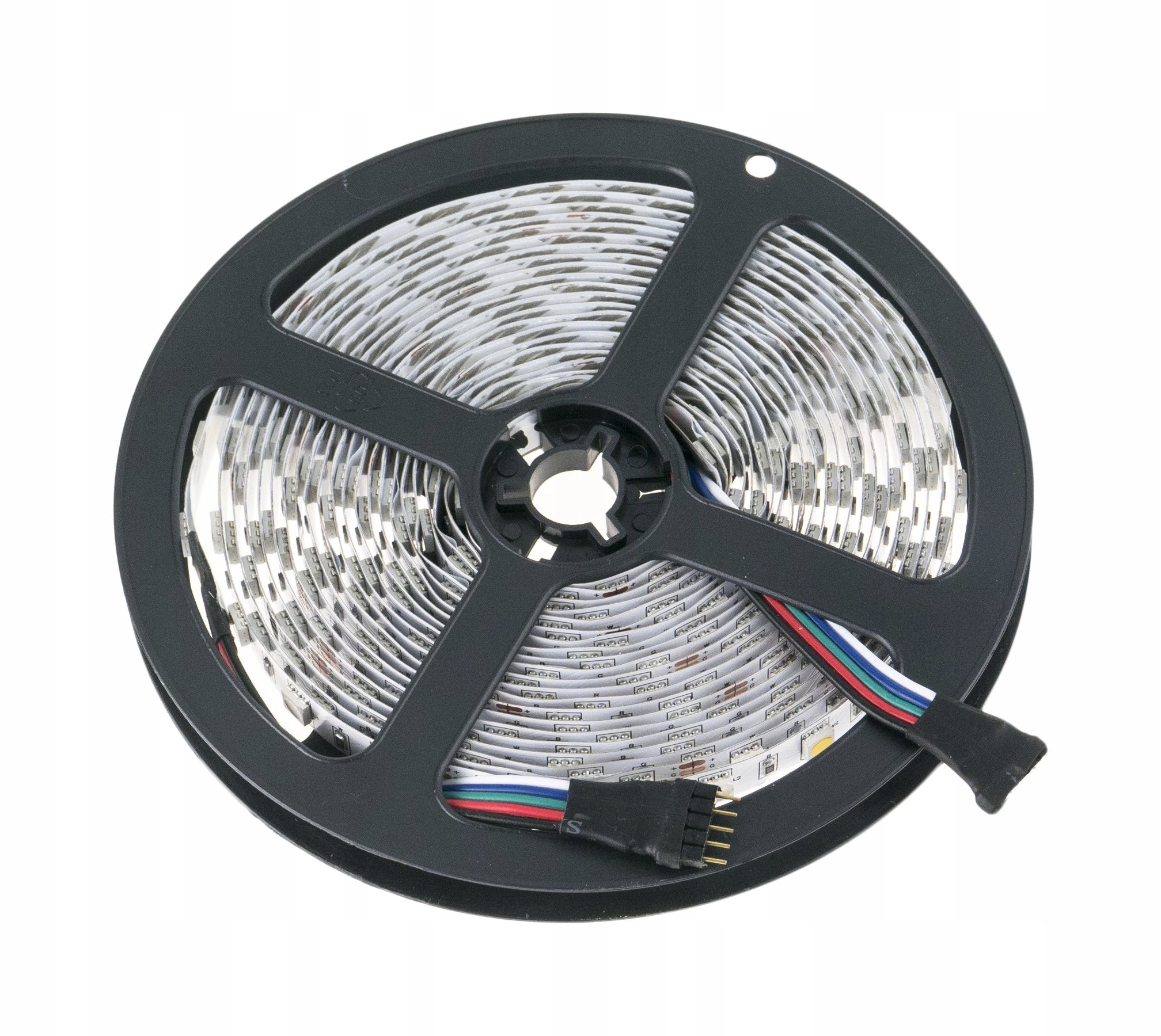 Для 1 м стрічки є 60 світлодіодів - 30 RGB SMD5050 та 30 білих SMD5050. Стрічка виробляється в 5-метрових рулонах. На кожному розділі, тобто 5 М стрічки, є 300 діодів SMD 5050 - 150 RGB і 150 білих діодів (теплий або холодний). Можна вирізати його для менших секцій у спеціально призначених місцях. Сегменти для різання стрічки розташовані кожні 10 см. Потім такий модуль складається з трьох світлодіодів RGB, 3 білих діодів та резистора, які розміщуються послідовно на гнучкому, білому фундаменті PCB