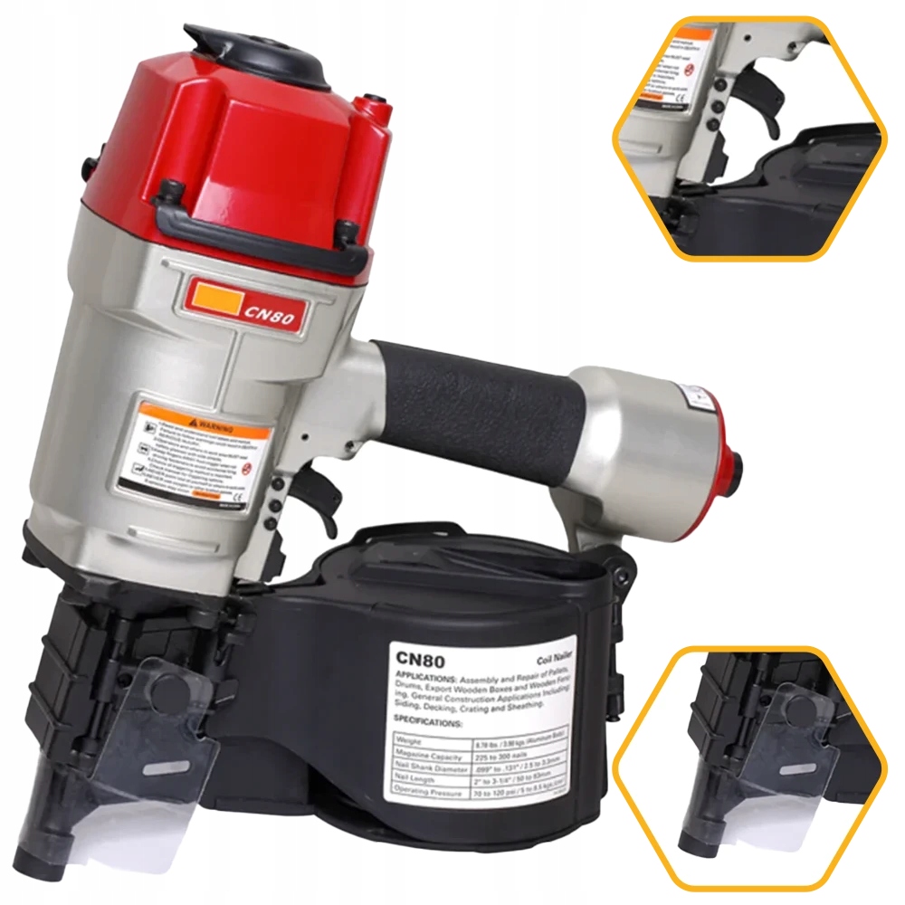 CN-80 — пневматичний барабанний цвяхозабивний пристрій, який обробляє цвяхи довжиною від 50 до 83 мм. Інструменти RGN характеризуються дуже високою якістю виконання, тому їх високо оцінили на ринку. Цвяхозабивач, який використовується для виробництва піддонів і для загальнобудівельних робіт