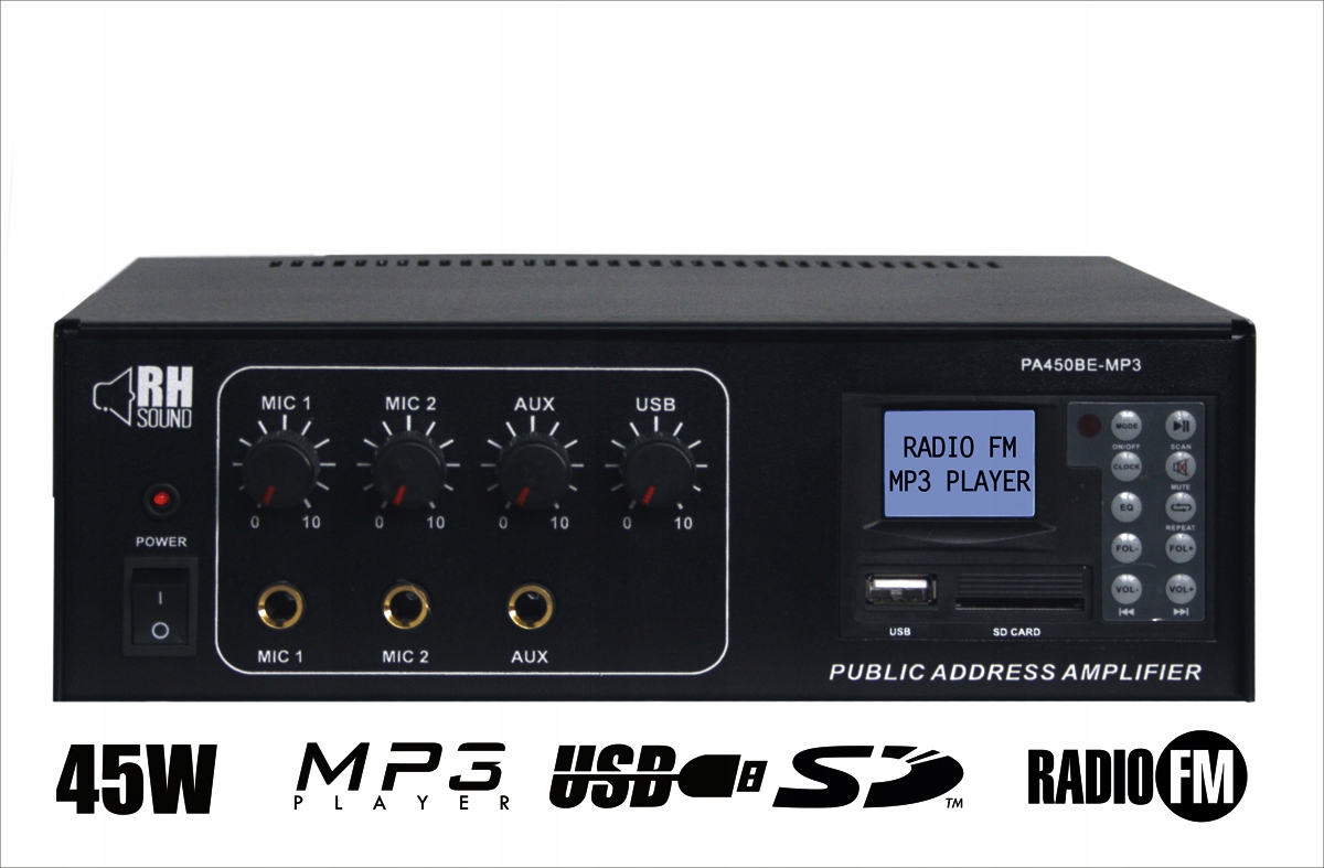 Міні -підсилювач аудіо радіо, який використовується як постачання невеликих звукових систем у громадських приміщеннях, салонах краси, кафе, ресторанів, офісів, невеликих комерційних та священних споруд. Завдяки можливості постачання напруги 12В та можливості підключення гучномовців та мегафонів, мегафони з низьким вмістом імпедансу можуть бути надані мобільною інформацією та рекламними звуковими системами, встановленими на автомобілях або оприлюднити громадський транспорт.