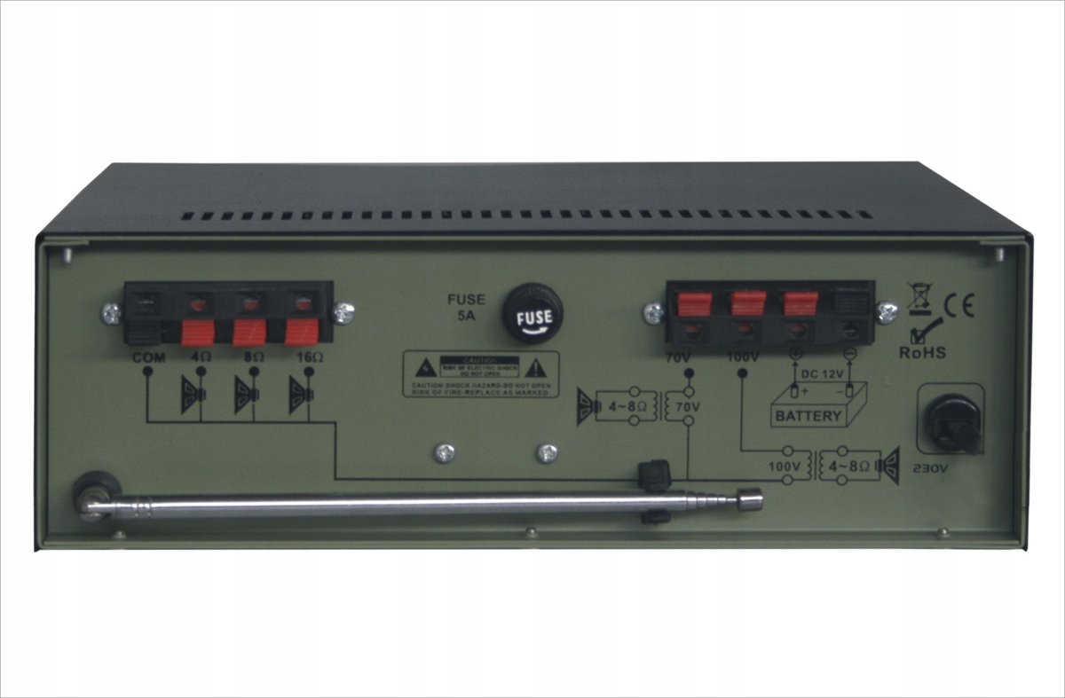 Міні -підсилювач аудіо радіо, який використовується як постачання невеликих звукових систем у громадських приміщеннях, салонах краси, кафе, ресторанів, офісів, невеликих комерційних та священних споруд. Завдяки можливості подачі напруги 12В та можливості підключення динаміків та мегафонів, низький показник може надати мобільну інформацію та рекламні звукові системи, встановлені на автомобілях або оприлюднювати громадський транспорт. Гравець зчитує дані із зовнішнього масового зберігання, підключеного до USB/ SD -розетків, бездротово завдяки випаровуванню із зовнішнім пристроєм через радіо підключення Bluetooth. Гравець також має чутливий FM -радіо -тюнер з синтезом цифрових частот. Гравець/радіомодуль має можливість дистанційного керування через інфрачервоний пульт дистанційного керування, що міститься в доставці. Вхідні дані: 2 x мікрофон, 1 x aux дозволяє підключати мікрофони та додаткове зовнішнє джерело звуку. 4