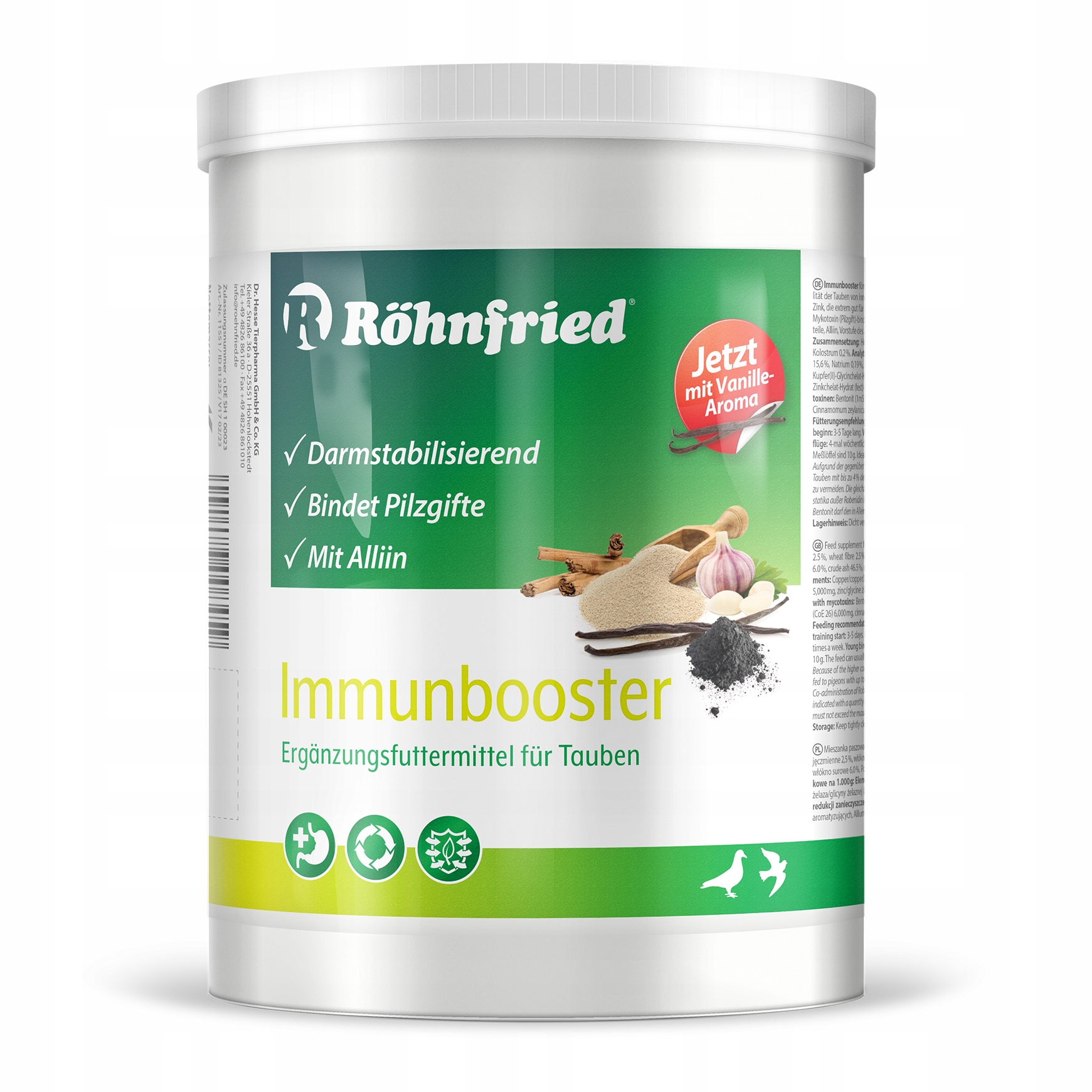 Röhnfried Immunbooster 500 g - передовий препарат, який зміцнює імунітет голубів. Містить функціональні мікроелементи (мідь, цинк, залізо) у формах з високою біодоступністю, пребіотичні інгредієнти, а також молозиво та аліїн (попередник аліцину). Додатковий зв’язувач мікотоксинів (бентоніт) допомагає зменшити вплив забруднювачів корму (наприклад, афлатоксин B1). Препарат підтримує швидку реакцію імунної системи, стан кишечника та загальний тонус, особливо у фазах стресу (тренування, польоти, виставки, вакцинація).