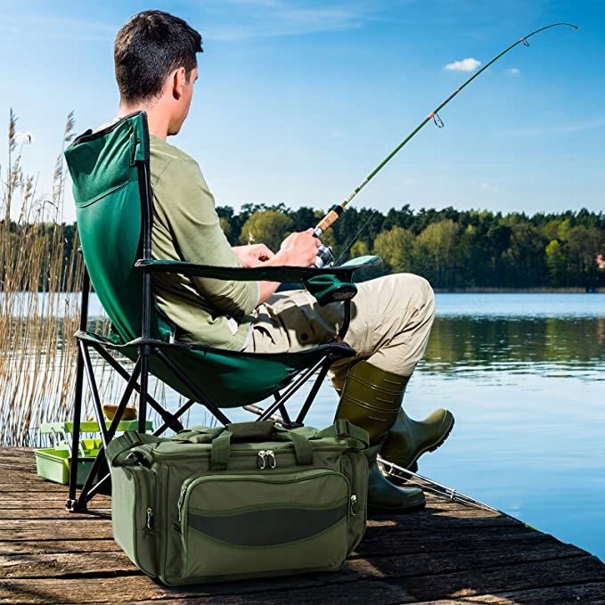 У цій практичній сумці для риболовлі достатньо місця для всього, що вам потрібно взяти з собою під час риболовлі. Корм, наживка, коробки із запасними гачками, обважнювачі, поплавці та багато іншого добре відсортовані та, при необхідності, готові до негайного використання. Міцний і водонепроникний матеріал допоможе захистити вміст сумки від дощу і бризок води. Кілька бічних кишень на блискавці забезпечують додатковий простір для дрібниць. М’які ручки на липучці та м’який регульований плечовий ремінь полегшують перенесення.