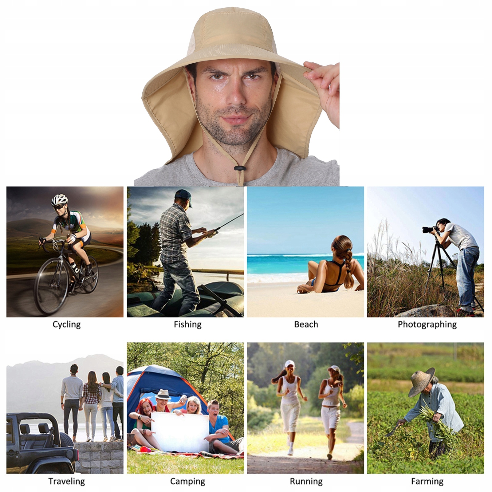 - Сонячний капелюх ідеально підходить для пляжу, басейну, парку, кемпінгу, плавання на човнах, риболовлі, походах, садівництва або занять спортом та на свіжому повітрі. Забезпечення безпеки капелюха у вітряні дні.