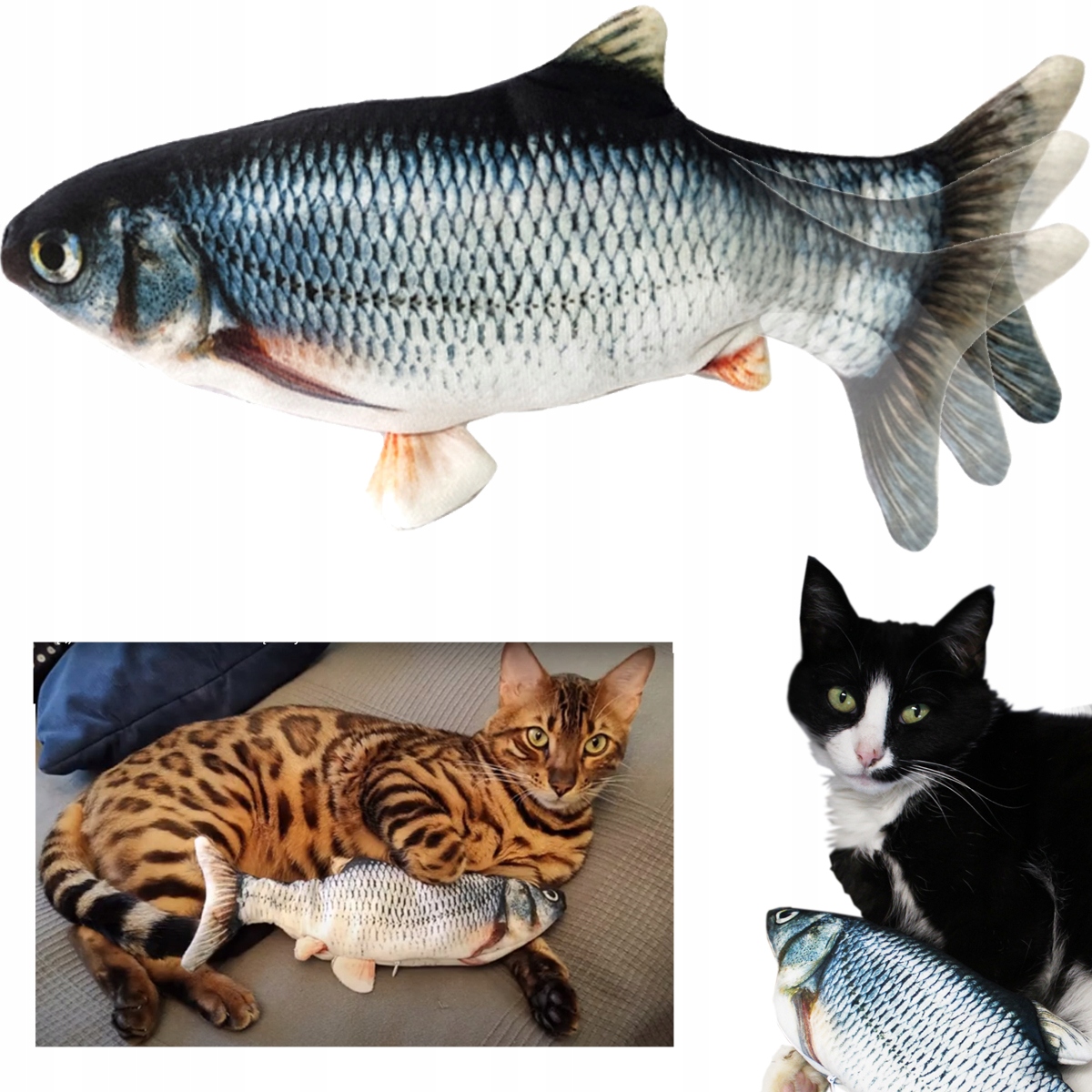 Іграшка являє собою м'яку плюшеву іграшку у формі риби, створену в 3D. Вона має дуже реальний вигляд і своїми розмірами нагадує справжню рибу, а як ми знаємо, собаки і коти люблять рибу.
