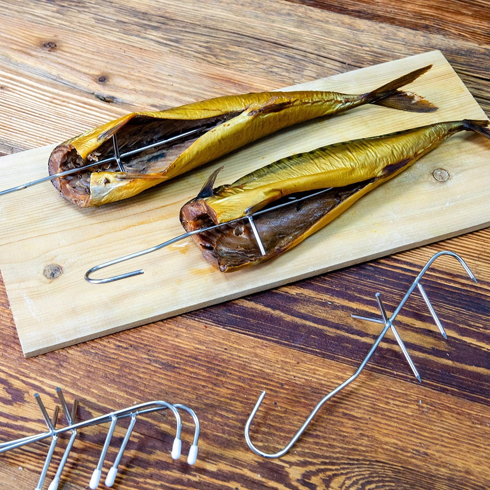Відкрийте смак смачних, домашніх, копчених рибних продуктів. Приготуйте їх легко в Смокі, використовуючи наші гачки для куріння з трьома спеціально профіленими кінчиками з нержавіючої сталі. Дизайн цих гачків дозволяє легко розгорнути продукти в Smokehouse, а потім на кухні чи коморі.