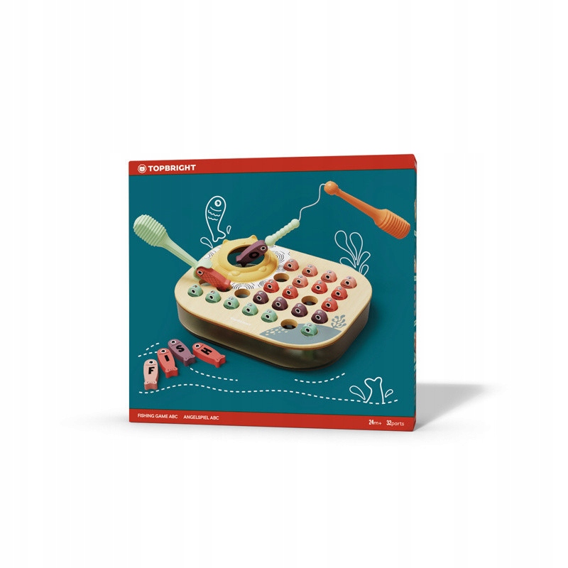 Завдяки магнітній грі від TOPBRIGHT дворічні діти тренують свою моторику та вивчають алфавіт. На кожній рибці є буква, яку діти повинні правильно підібрати до місця на дошці. Малюки ловлять різнокольорових екземплярів за допомогою магнітної вудки або ловця та годують голодного кота.