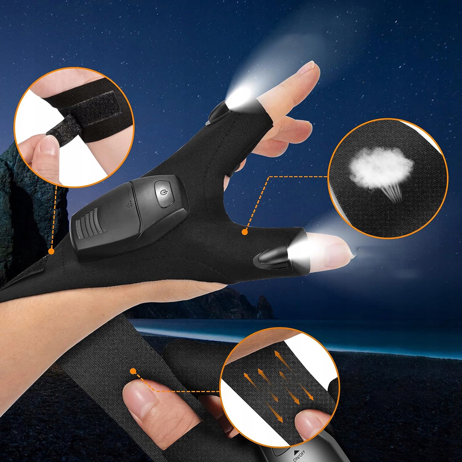 - М’які світлодіодні рукавички не будуть заважати роботі пальців, незалежно від того, чи це нічна риболовля, біг, ходьба з собаками, кемпінгові гаджети, їзда на рукавичках, читання тощо, якщо вам потрібно працювати вночі, ви можете забезпечити яскраве світло.
