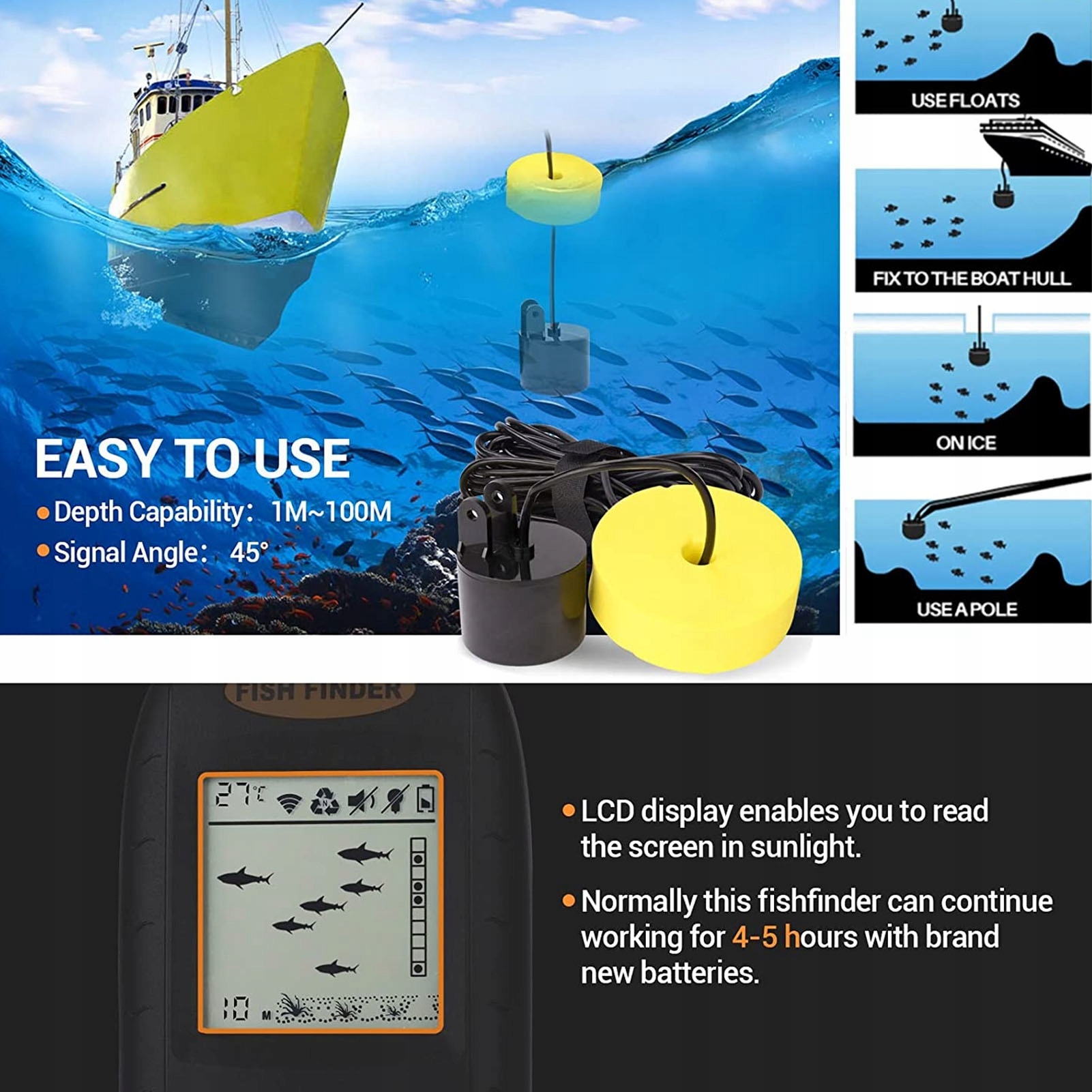 4. Сповіщення про рибу та рибні зграї: коли ви кинете датчик ехолота у воду й увімкнете дисплей, ви отримаєте сповіщення, коли риба чи зграї риб пропливуть поблизу. Він може безперервно працювати принаймні 4-5 годин із абсолютно новими батареями.