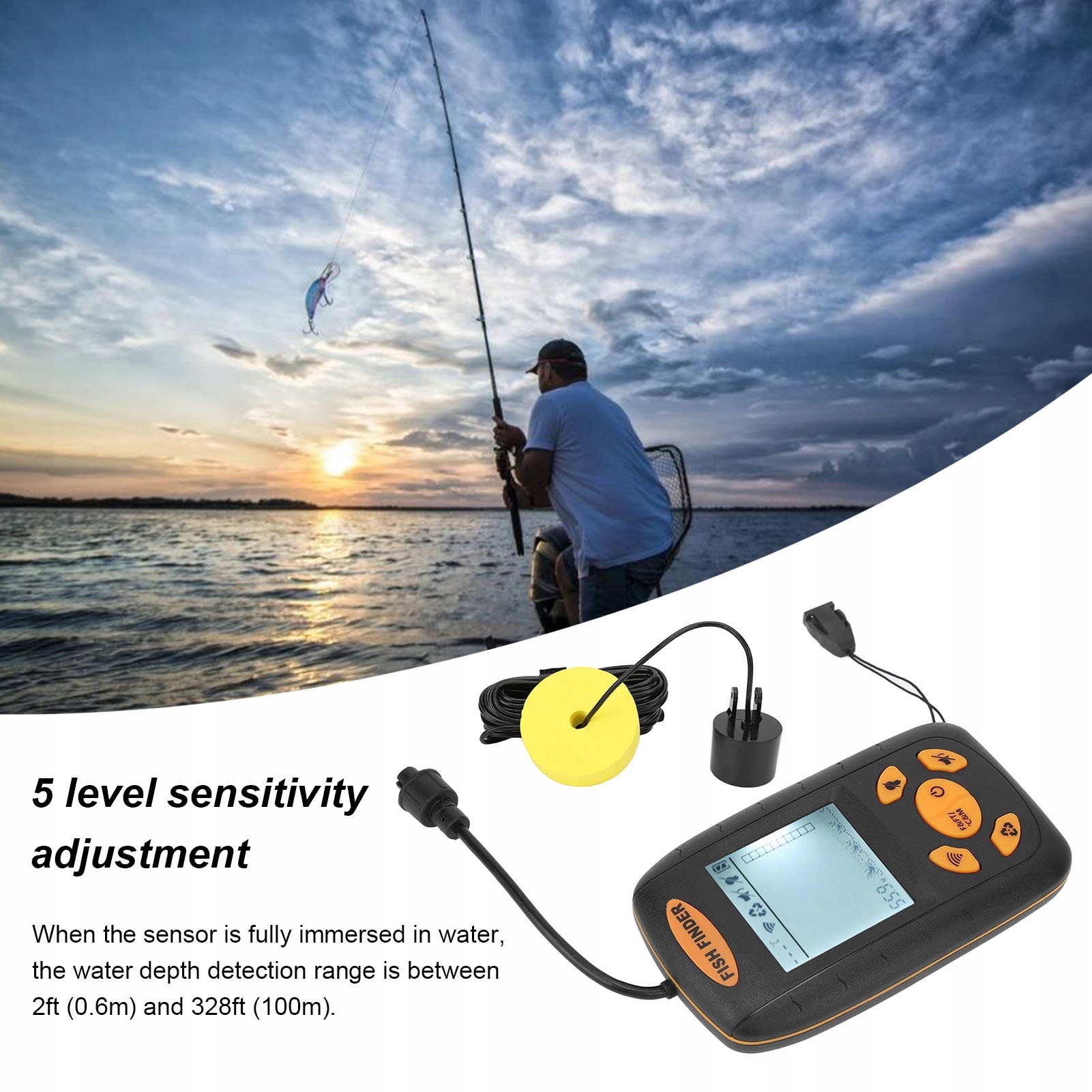 3. Портативний дизайн: ехолот для човна-байдарки призначений для тримання лише в одній руці. У набір входить шнурок, який можна носити на шиї, коли ви зайняті каякінгом або човном. У той же час, завдяки 5-рівневому регулюванню чутливості, ви можете ловити рибу в чистій або каламутній воді.