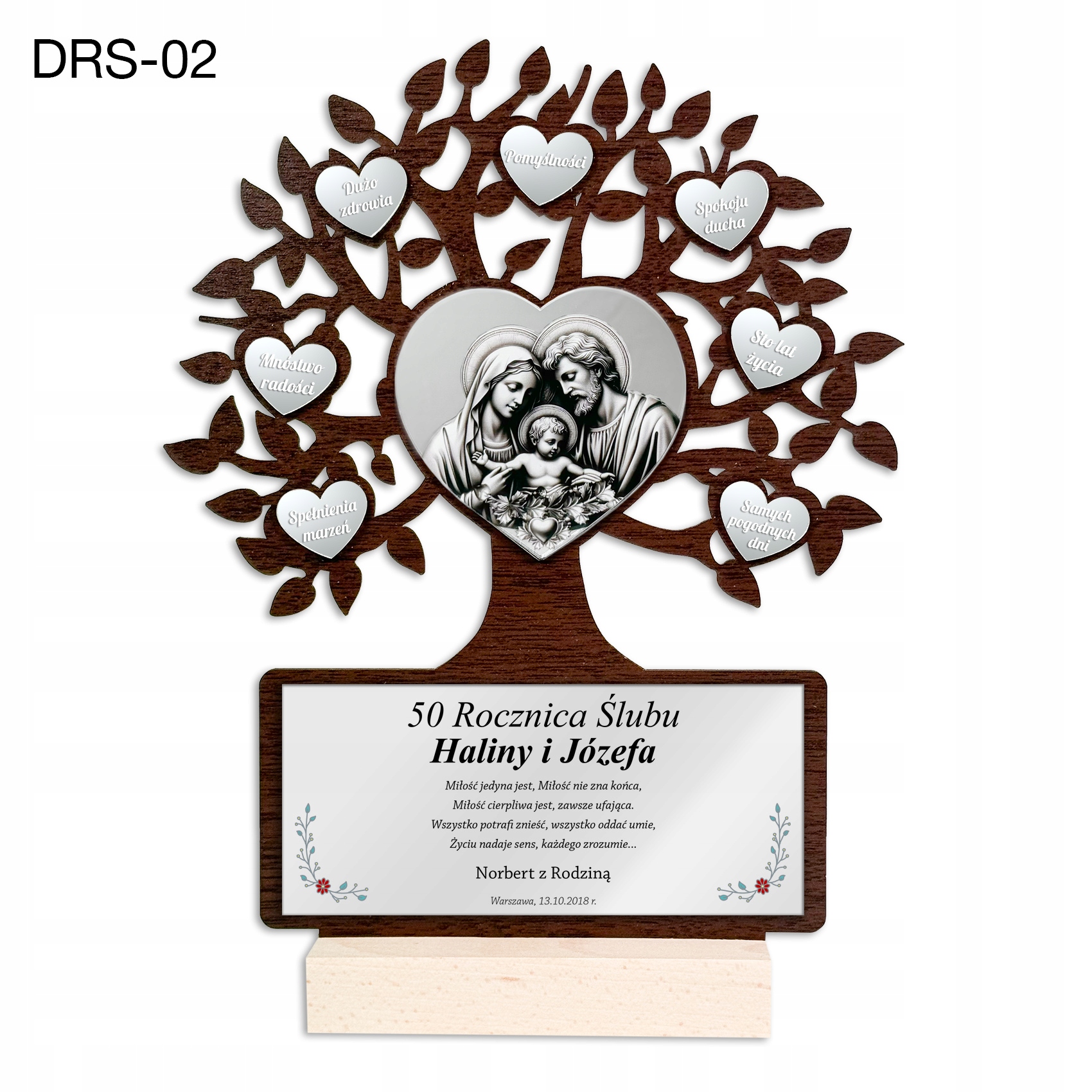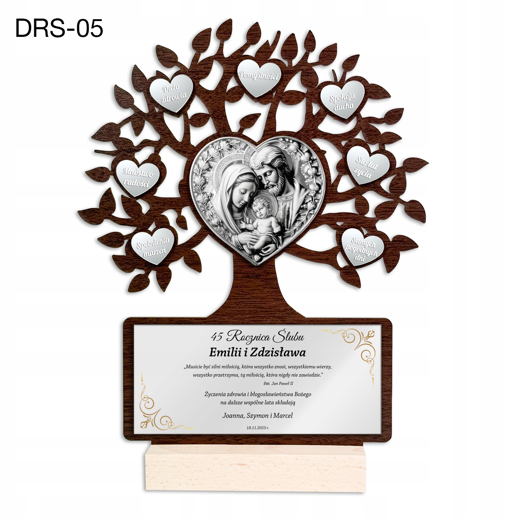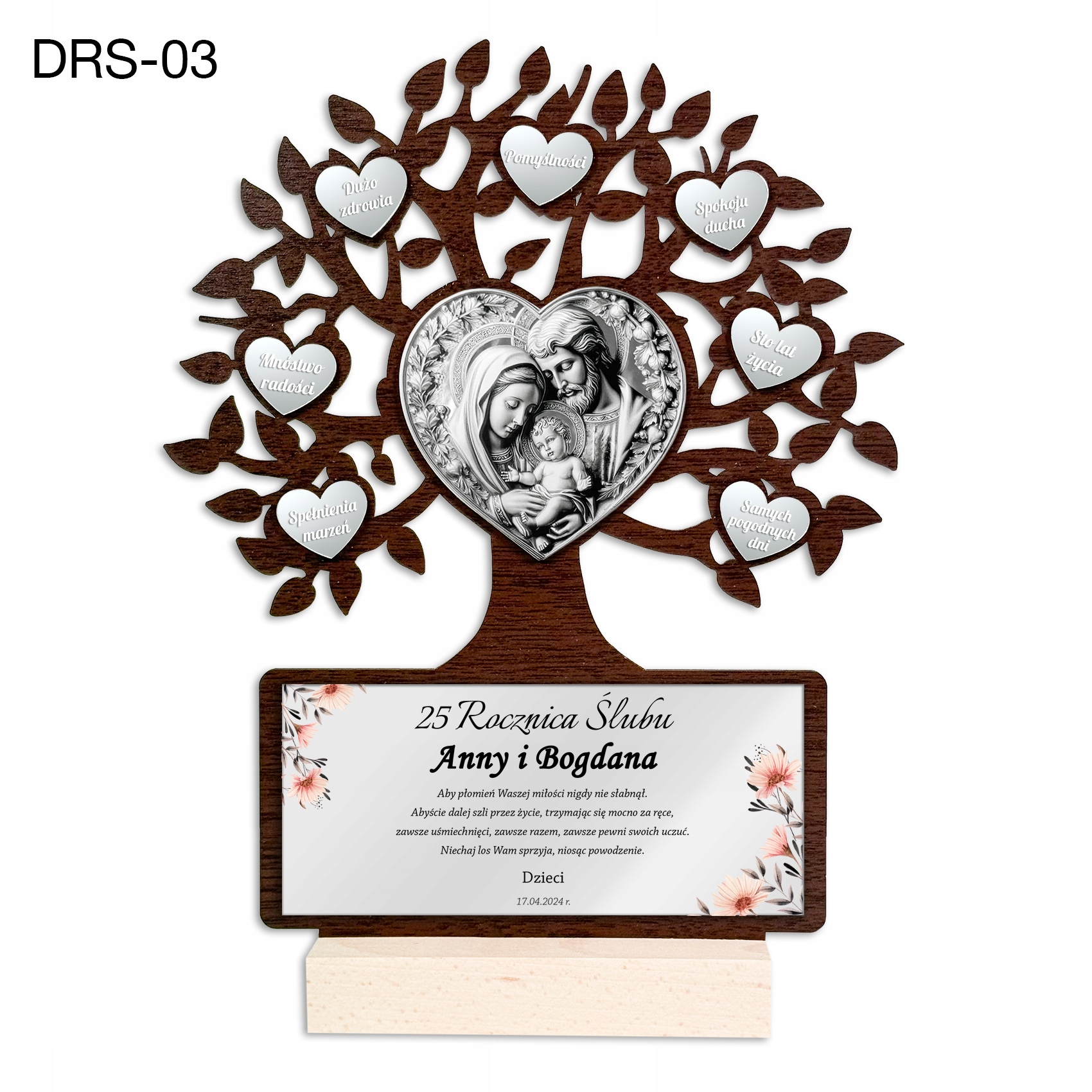 Якщо ви шукаєте елегантний та особистий подарунок на річницю весілля, Дерево щастя із зображенням Святого Сімейства стане ідеальним вибором. Виготовлена з масиву МДФ, з гарними деталями і дзеркальним покриттям, вона стане унікальним сувеніром для батьків, бабусь і дідусів або близьких. Завдяки персоналізованим елементам, таким як срібні серця та табличка з присвятою, подарунок стає унікальним і адаптованим до події. Це прекрасний символ любові та підтримки, який надовго залишиться в пам'яті одержувачів.