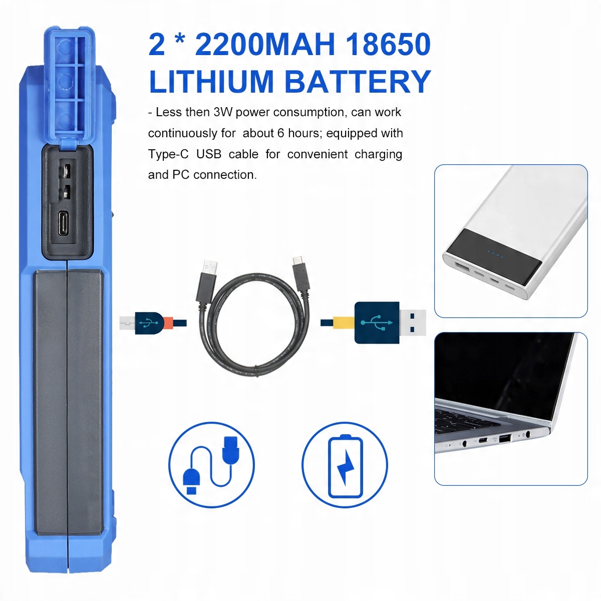[2*2200mAh літієва батарея літієва батарея] Споживана потужність менше 3 Вт, може безперервно працювати близько 6 годин; оснащений кабелем USB Type-C, що забезпечує зручну зарядку та підключення до комп’ютера.