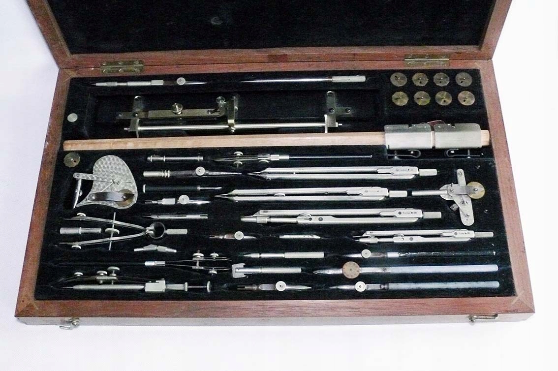 Набір приладів для креслення в оригінальному дерев'яному футлярі фірми, обшитому оксамитом.