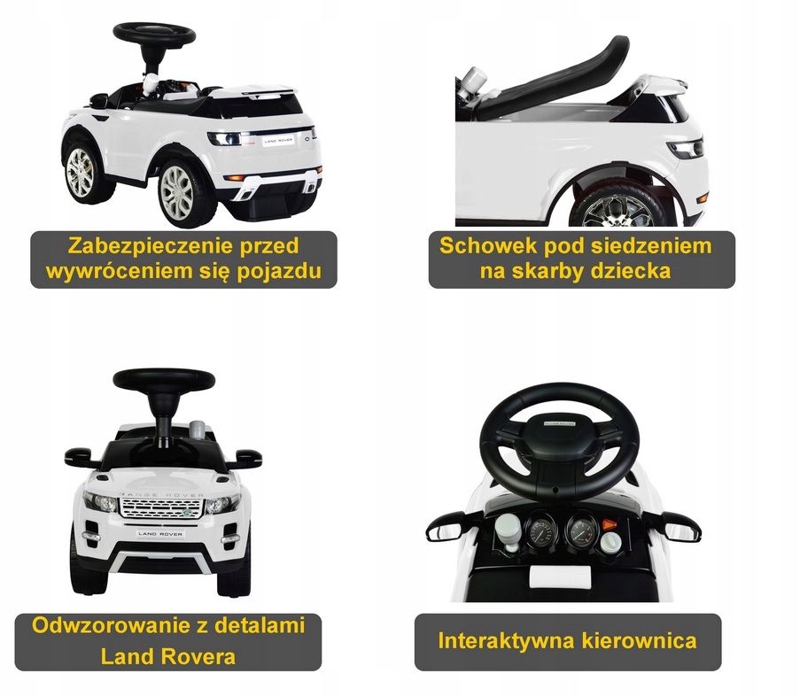 Представлений продукт поєднує в собі безліч окремих функцій, які дозволяють батькам швидко модернізувати автомобіль в залежності від поточних потреб дитини. Оснащення ходунків Land Rover мультимедійними елементами, такими як гудок, який відтворює різні мелодії, дає змогу дитині повніше насолоджуватися поїздкою або вдосконалювати свої навички ходьби.
