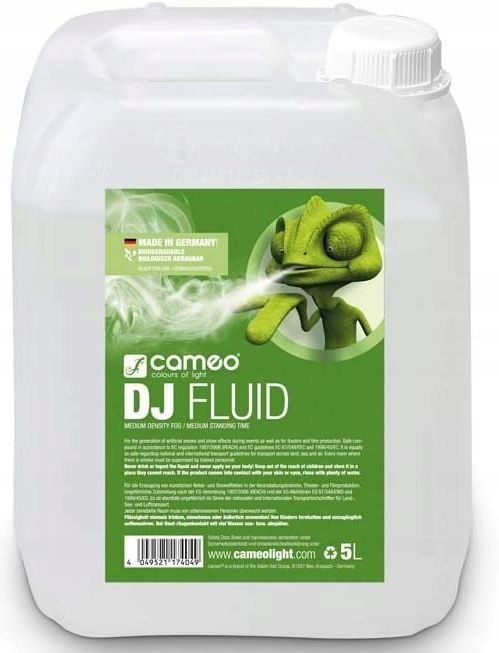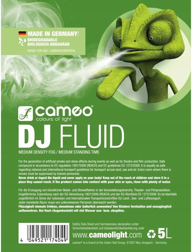 DJ Cameo Fluid розроблена для професійних машин для генерації туманів і готова до використання. Він виробляє в середньому середні жести із середньою міцністю, яка завдяки своїм хорошим властивостям відбиття світла ефективно гармонізується зі світлими ефектами. Cameo DJ-FLID, що виробляється в Німеччині, є без запаху, нетоксичним і є біологічним.