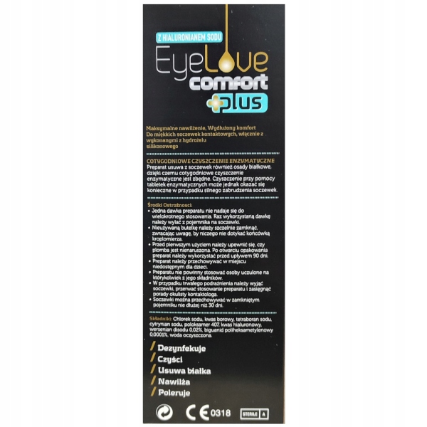 Найважливішим інгредієнтом рідини EyeLove Comfort Plus є гіалуронат натрію. Має регенеруючі та зволожуючі властивості, забезпечує комфорт і свіжість. Гіалуронат натрію є природним зволожуючим інгредієнтом, тому флюїди з його вмістом рекомендовані навіть користувачам із дуже чутливими очима.