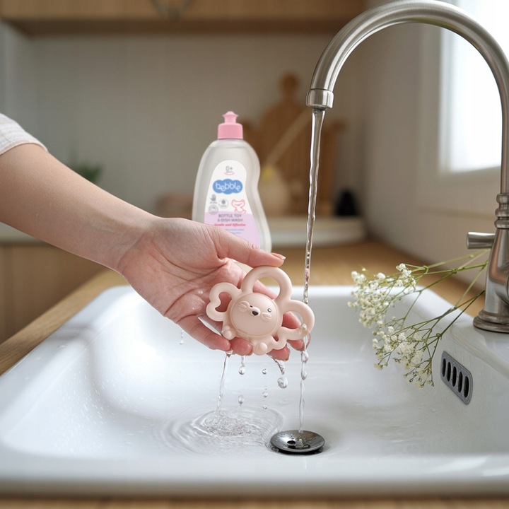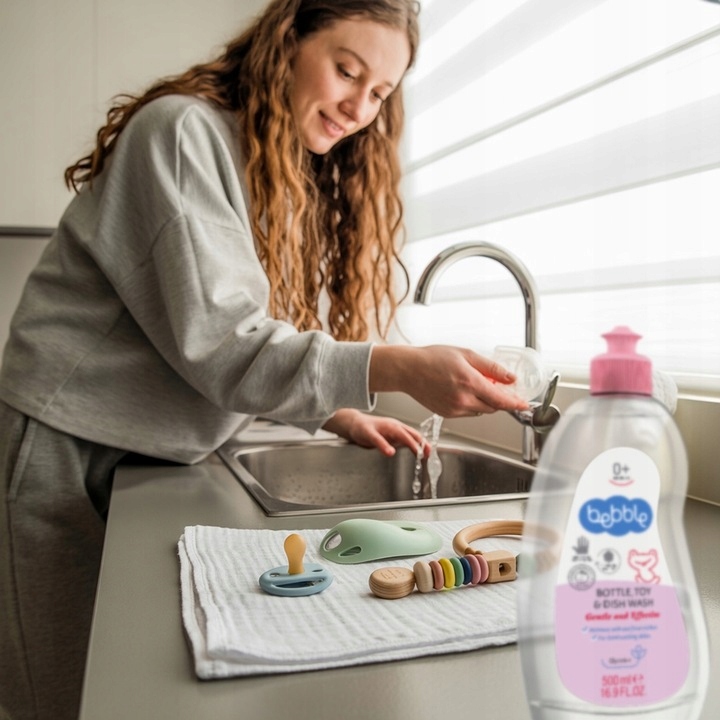 Вимийте дитину пляшки, іграшки та аксесуари в розчині 2-3 мл засобу для миття пляшок, іграшок і посуду Bebble на 1 літр теплої води.