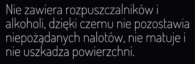 На відміну від класичних рідин для чищення скла, не містить шкідливих речовин, які можуть пошкодити екран або покриття, що його захищає (наприклад, олеофобне покриття, що захищає екран від надмірного відкладення).