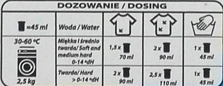Склад:ліпаза, триацилгліцерин, протеїнази. Продукт містить речовини PBT/vPvB: октаметилциклотетрасилоксан, октаметилциклотетрасилоксан, декаметилциклопентасилоксан, аніонні поверхнево-активні речовини менше 30%, але більше 15%, неіонні поверхнево-активні речовини менше 15%, але більше 5%, ферменти, консерванти. Речовини, що впливають на класифікацію: спирт, С12-14, етоксильовані, сульфати, солі натрію; Етоксильований тридециловий спирт (C13.8EO) NanoSilver, Nanocinc