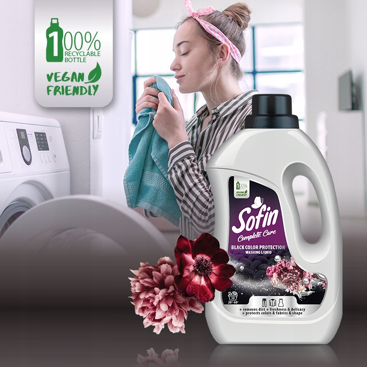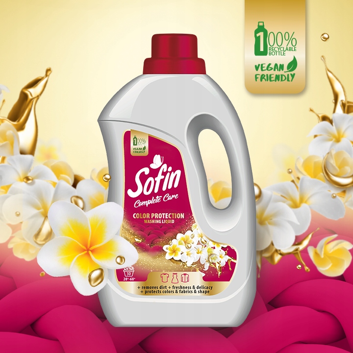 Квіткові композиції, що містяться в пральній рідині Sofin, нададуть вашому одягу свіжість і делікатність.